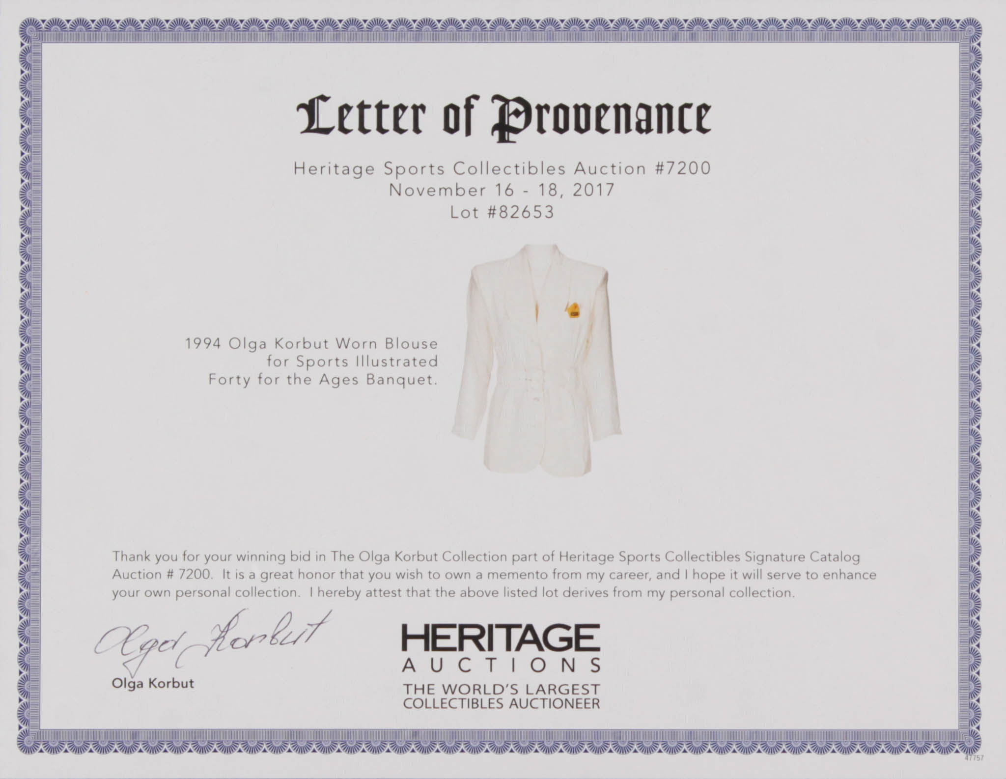 The lot contains an item from the personal collection of Olga Korbut and includes an official Korbut Letter of Authenticity for authenticity purposes.