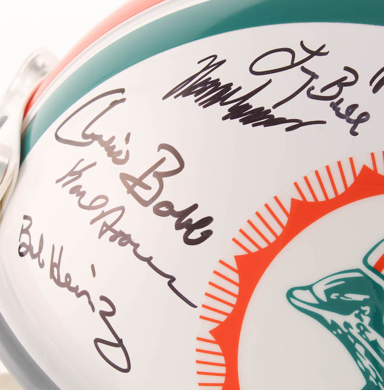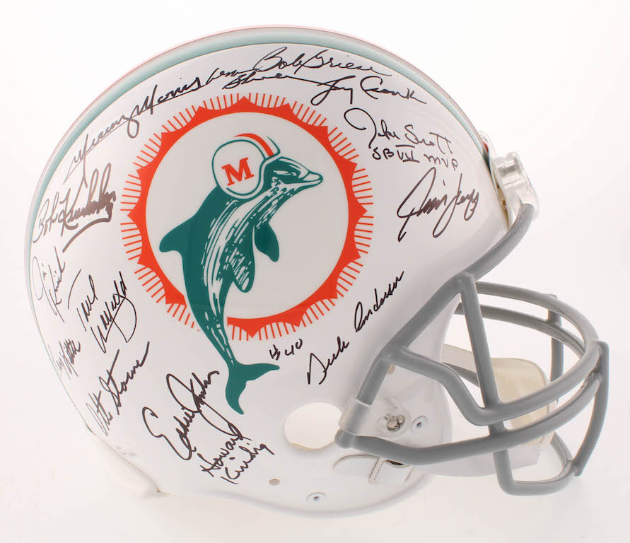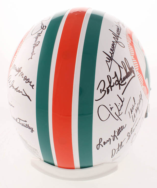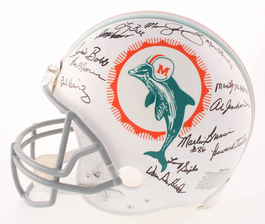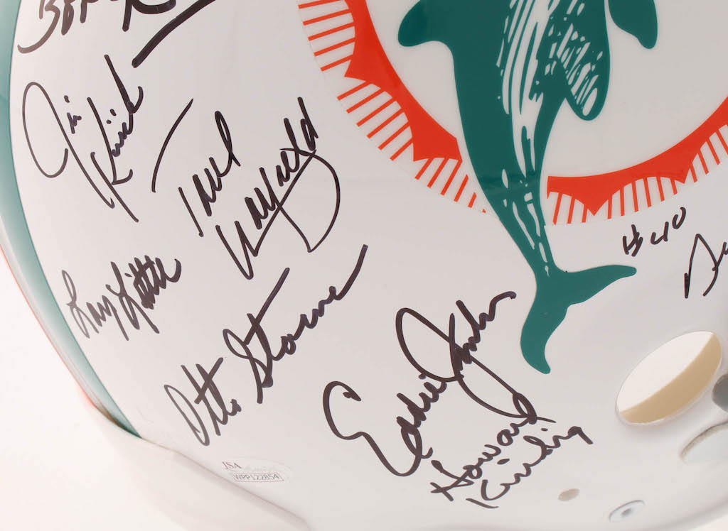Riddell Miami Dolphins full-size authentic on-field helmet. Hand-signed in black felt-tip pen by Bob Griese, Larry Little, Mercury Morris, Jake Scott, Dick Anderson, Bob Kuechenberg, Howard Kindig, Otto Stowe, Paul Warfield, Charlie Babb, Bob Heinz, Larry Ball, Al Jenkins, Marlin Briscoe, Vern Den Herder, Howard Twilley, Larry Seiple, Maulty Moore, Marv Flemming and (8) others.