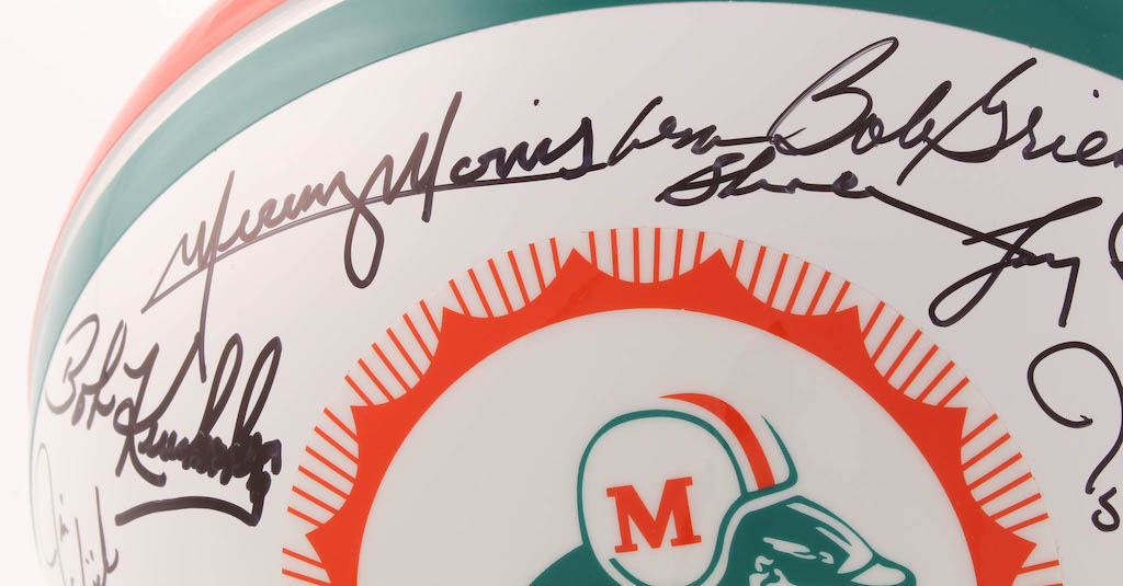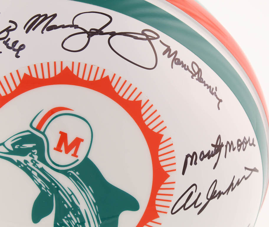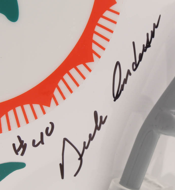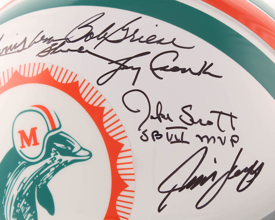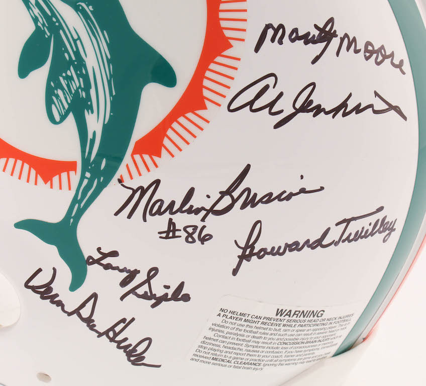Riddell Miami Dolphins full-size authentic on-field helmet. Hand-signed in black felt-tip pen by Bob Griese, Larry Little, Mercury Morris, Jake Scott, Dick Anderson, Bob Kuechenberg, Howard Kindig, Otto Stowe, Paul Warfield, Charlie Babb, Bob Heinz, Larry Ball, Al Jenkins, Marlin Briscoe, Vern Den Herder, Howard Twilley, Larry Seiple, Maulty Moore, Marv Flemming and (8) others.