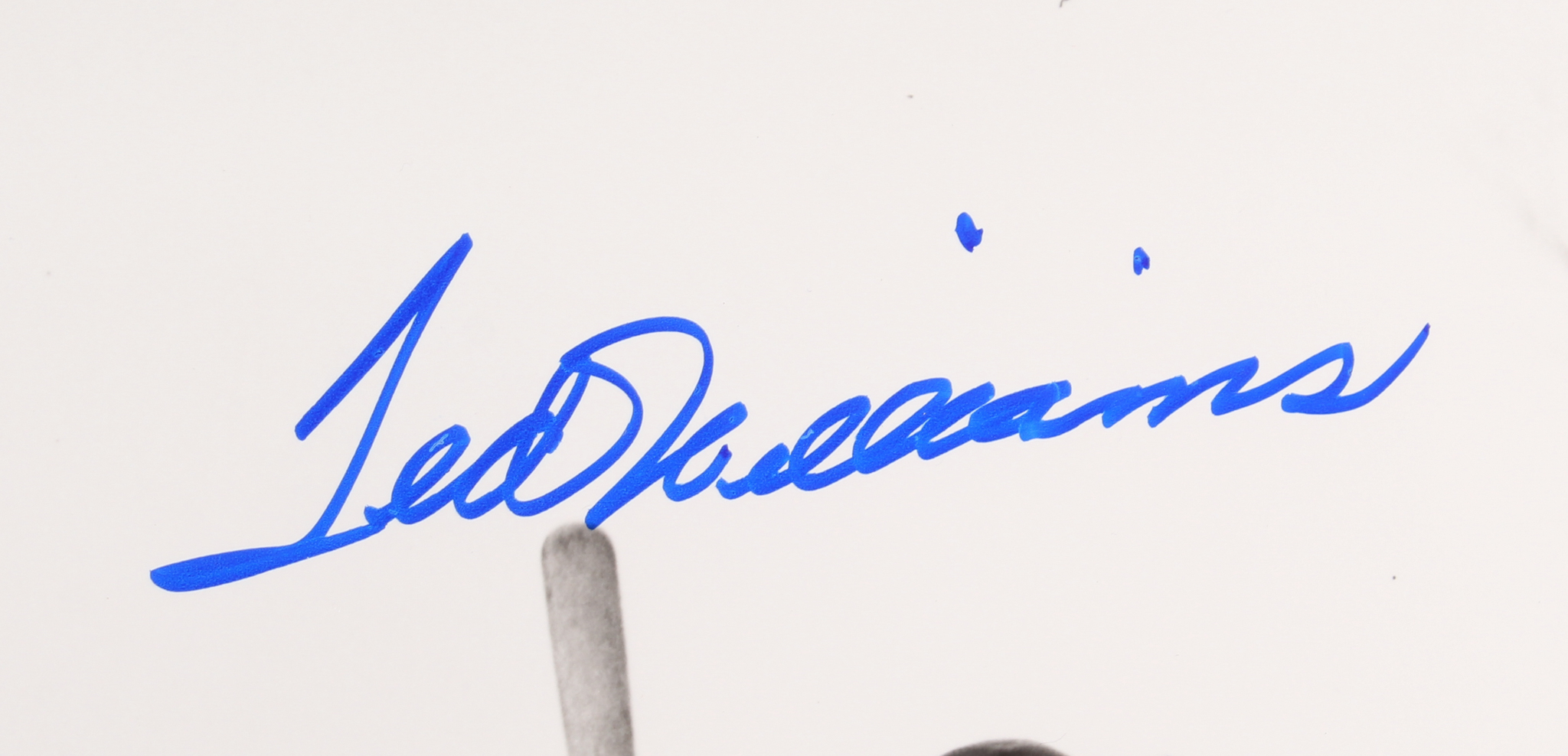 Custom framed display measures 21" x 25" in size and features a photo that has been hand-signed in blue felt-tip pen by Ted Williams (D.2002, Boston Red Sox, HOF). Please see photos for details regarding the condition of the frame.