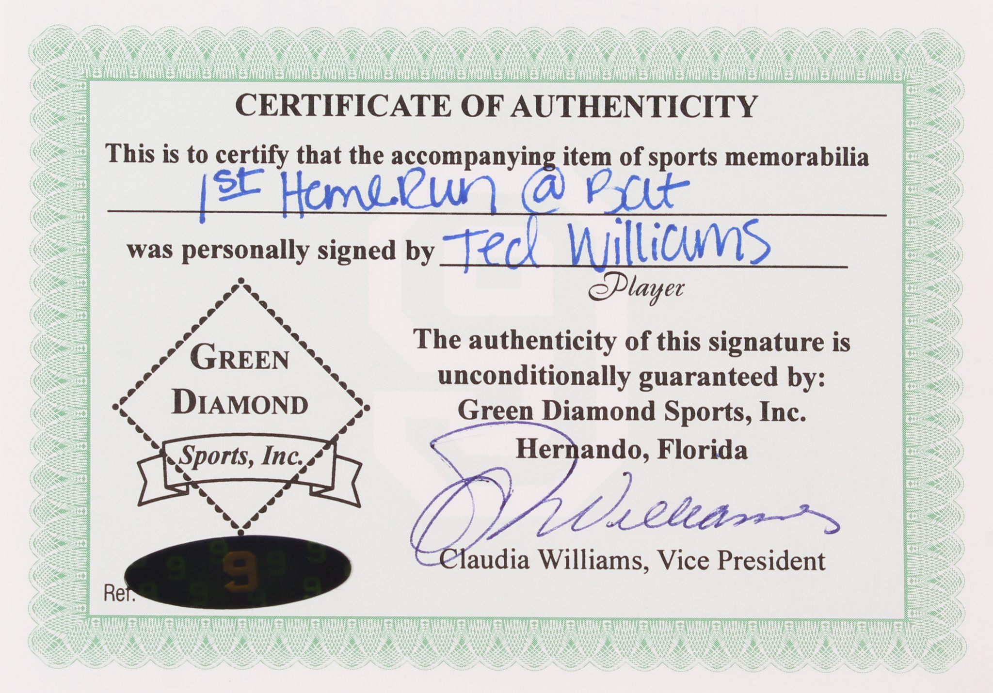 The lot / autograph(s) includes includes an official Ted Williams hologram and matching COA from Green Diamond as well as an official PSA/DNA hologram for authenticity purposes.