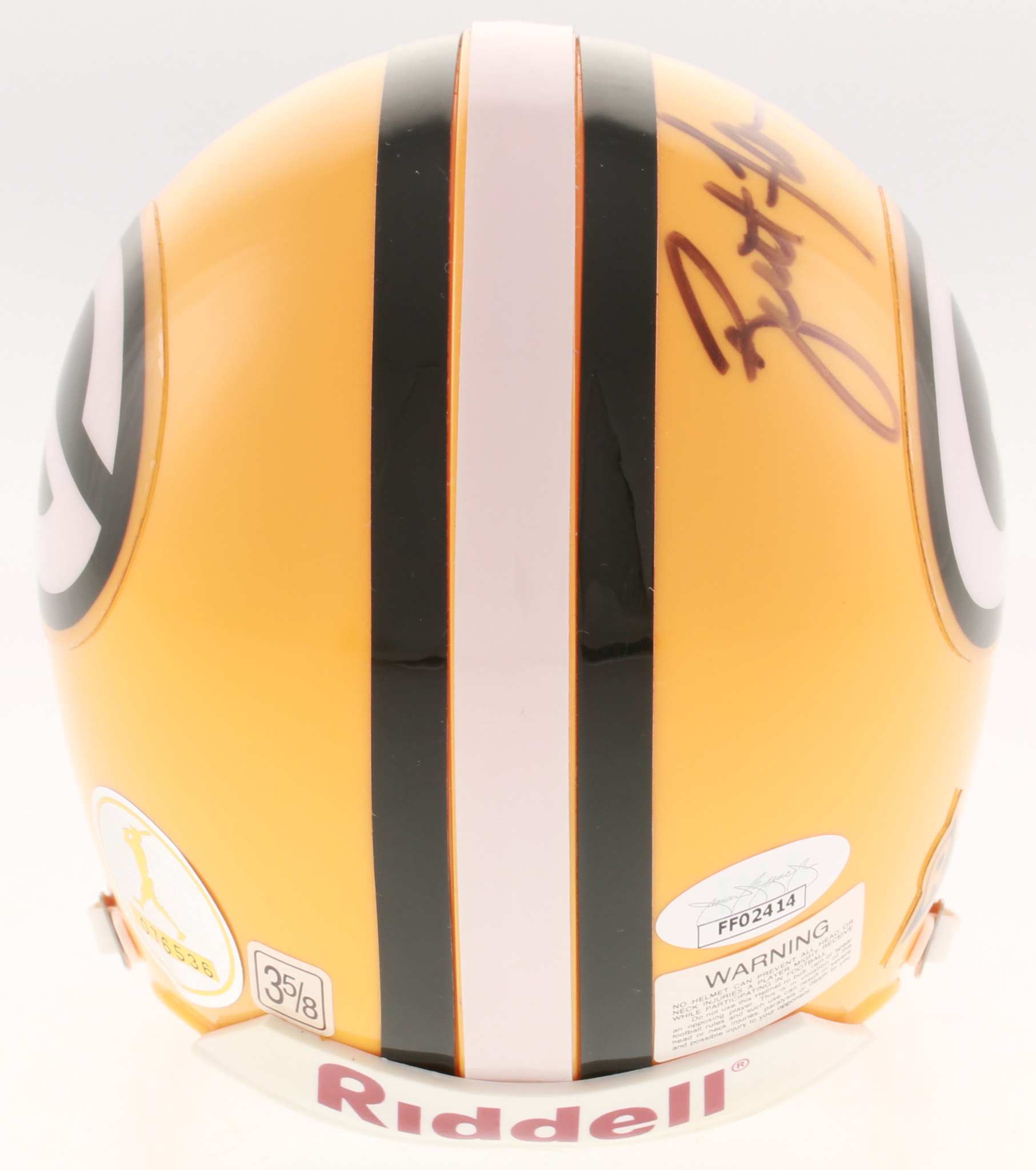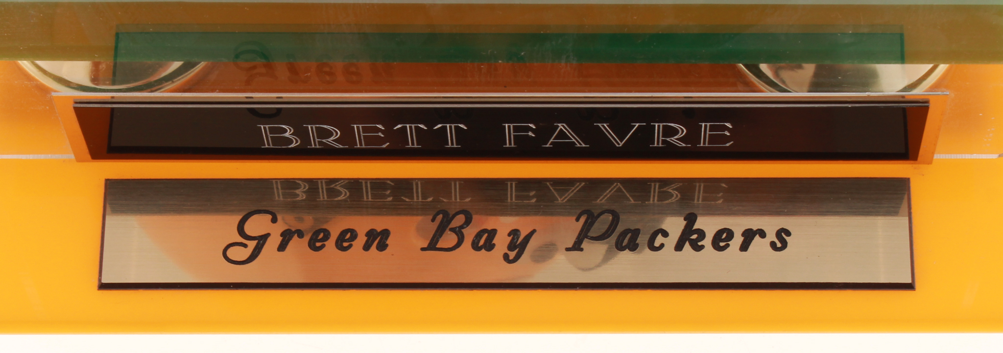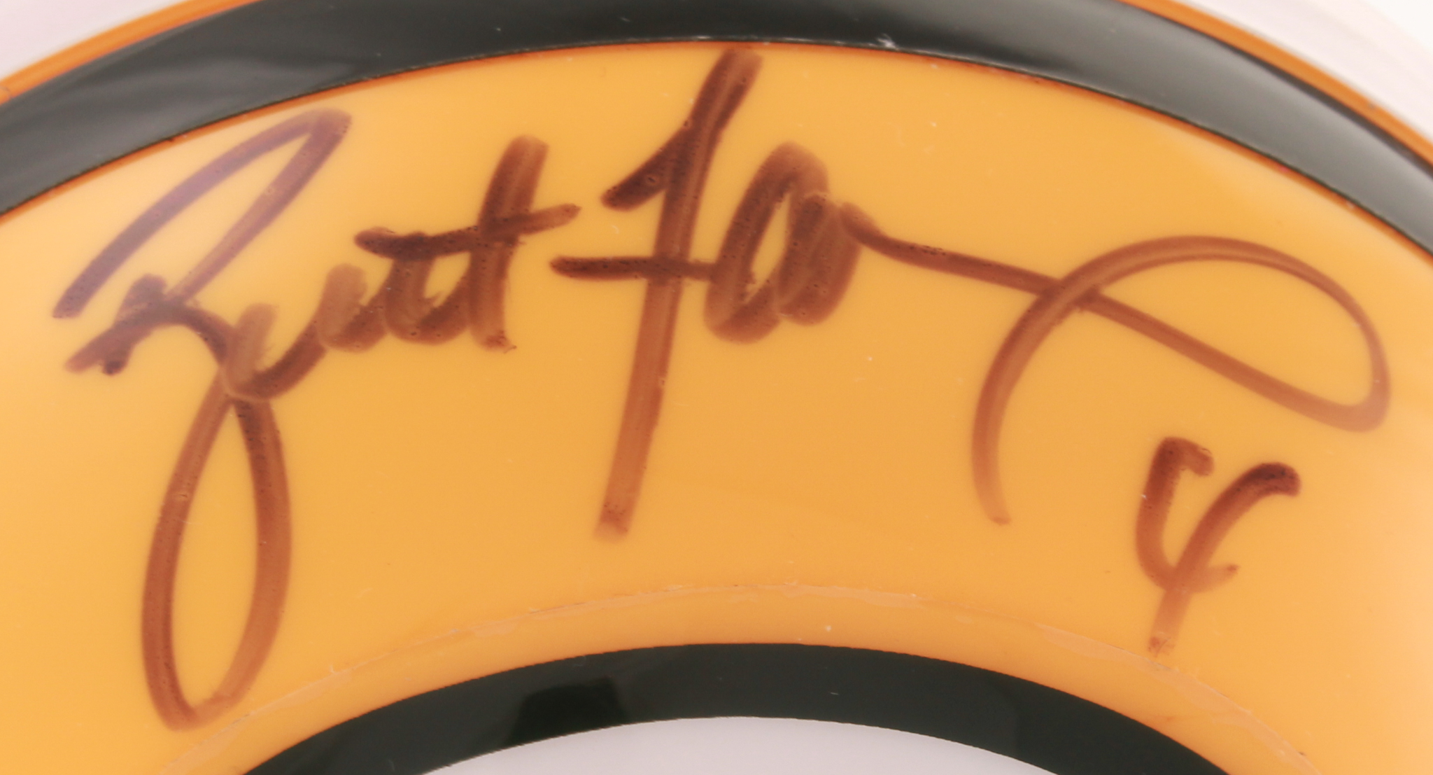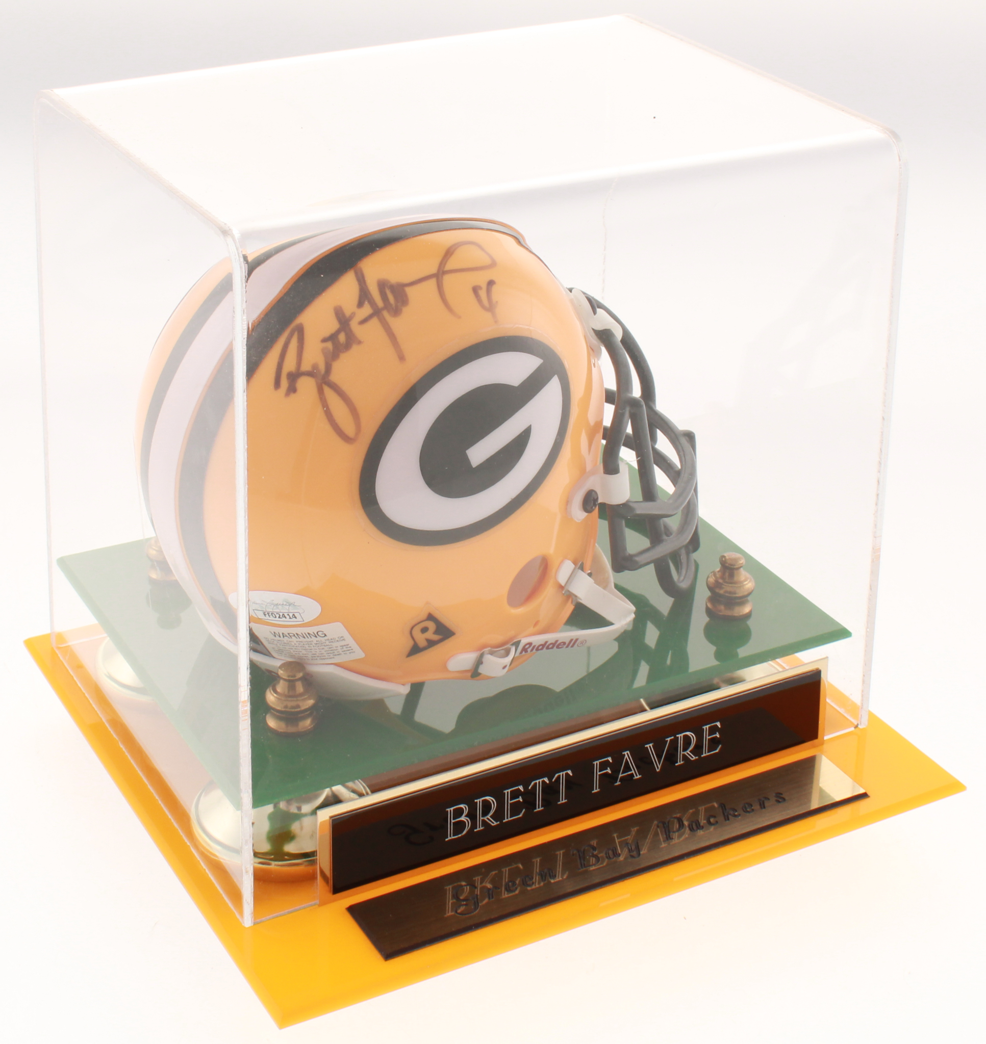 Riddell Green Bay Packers mini helmet has been hand-signed in black felt-tip pen by Brett Favre (HOF). Please note, includes display case as shown.