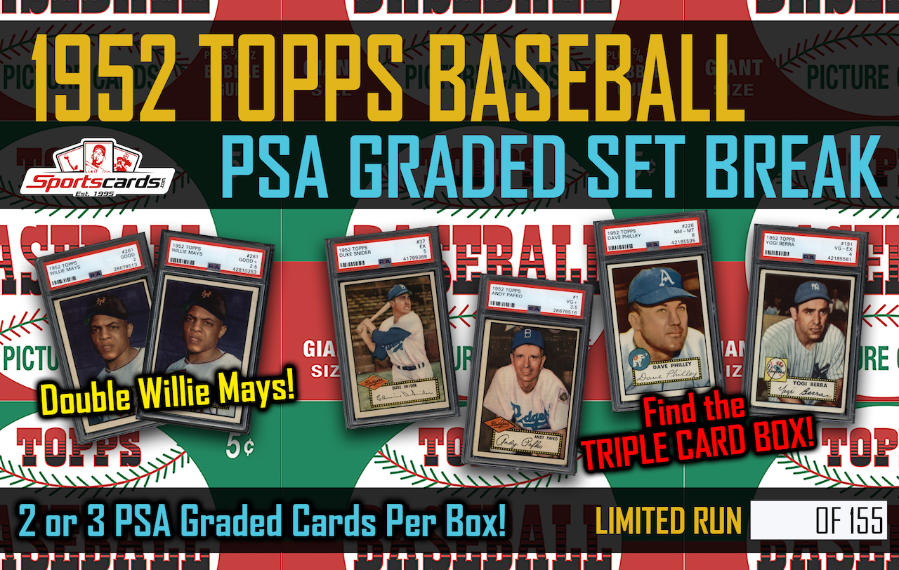 Each “1952 Topps Baseball PSA Graded Set Break” will have (2 OR 3) PSA Graded/Authenticated card from the 1-310 series. TWO of the boxes will contain a Willie Mays #261 card, ungraded these have a Beckett value of $6k each! Truly an exciting chance to get piece of the HOLY GRAIL of SET at a fraction of the price!