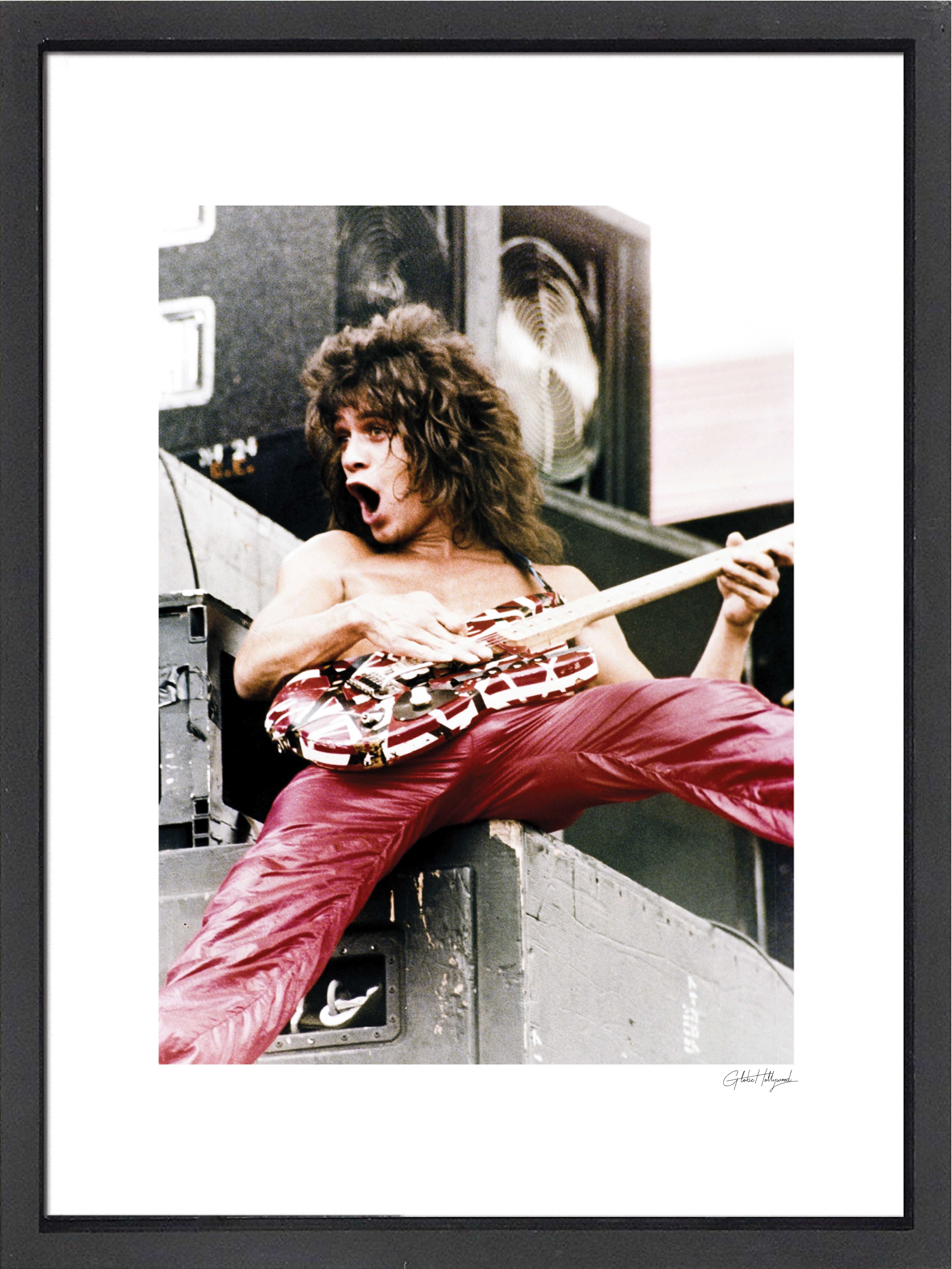 Custom frame measures 16" x 20" in size. Features a photo from Globe Hollywood of Eddie Van Halen.