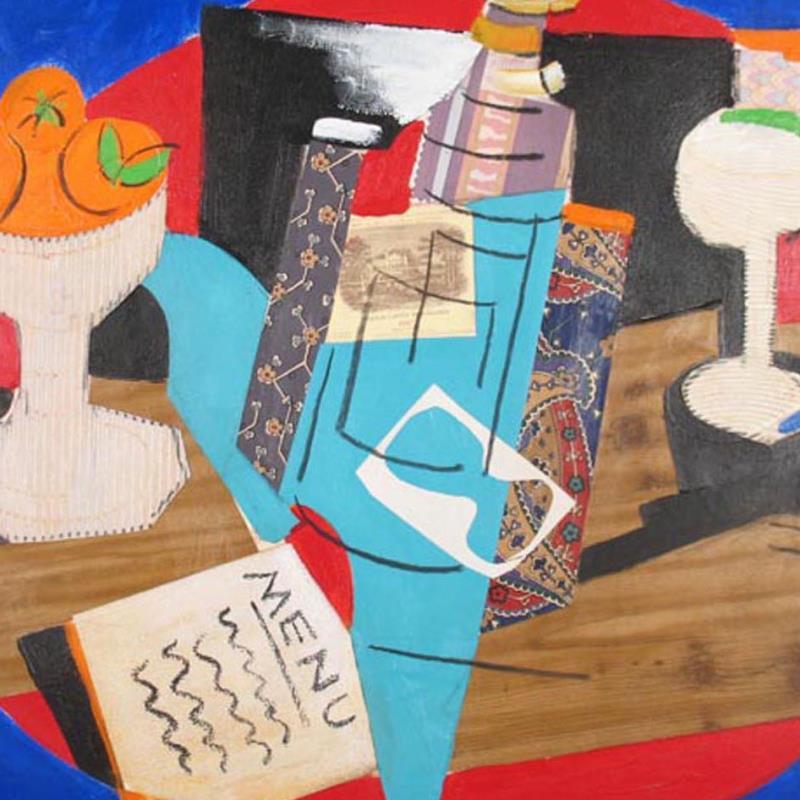 "Still Life with Lafite-Rothschild Label" is an original Mixed Media on stretched canvas by Wayne Ensrud. The piece is hand signed by the artist and comes with a Certificate of Authenticity. Measures approximately 24" x 31".