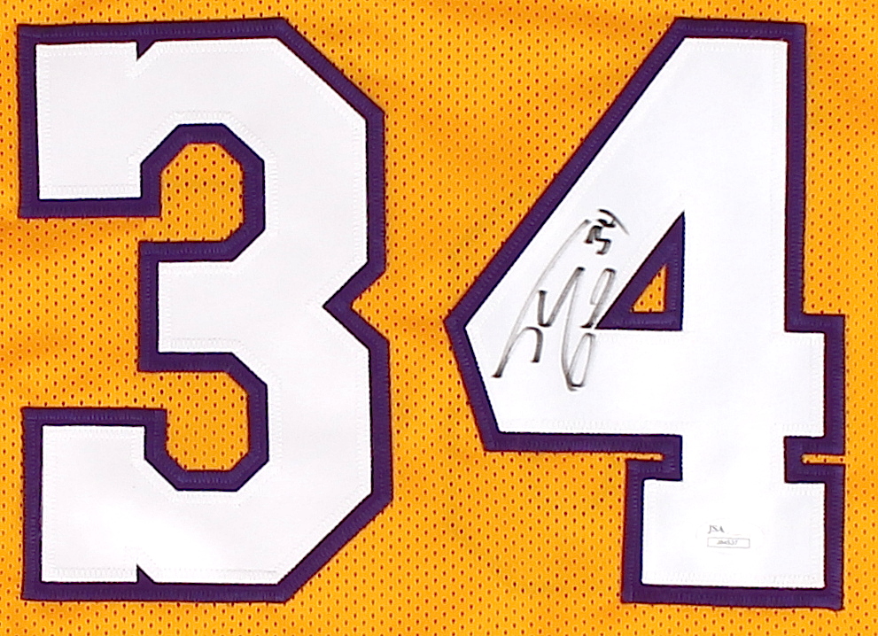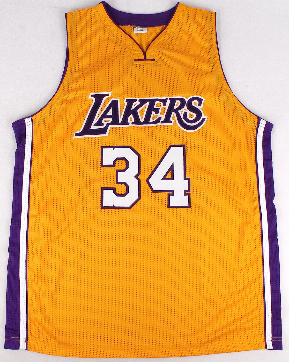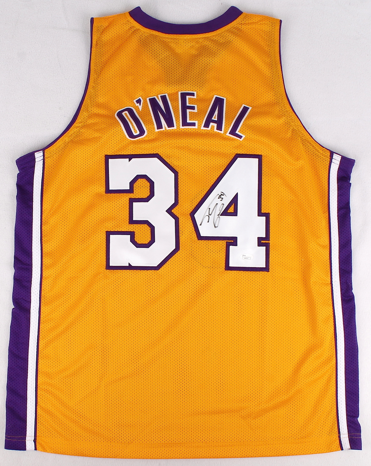 Custom on court style jersey. Size XL. Hand-signed in black felt tip pen by Shaquille O'Neal (Lakers). The autograph includes an official James Spence Authentication (JSA) hologram and matching COA for authenticity purposes.
