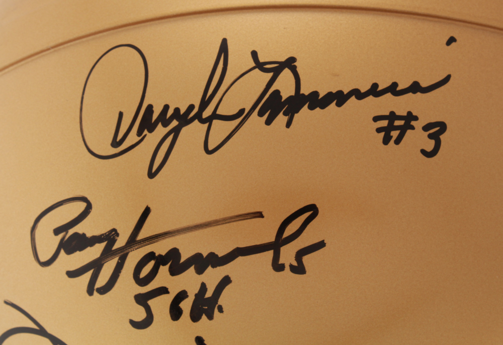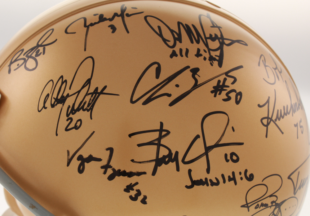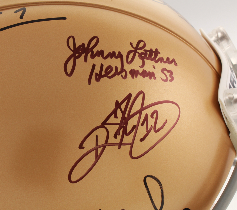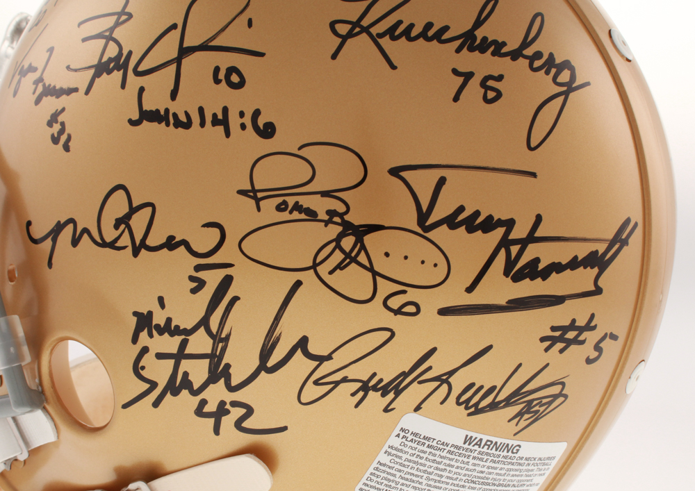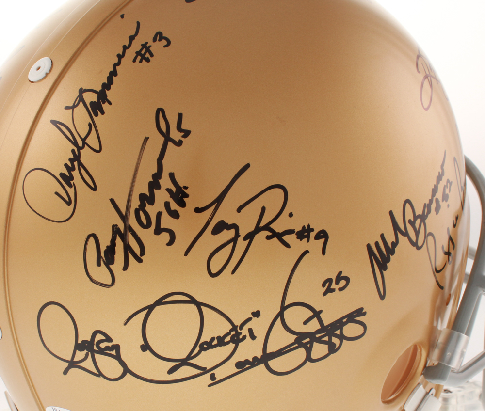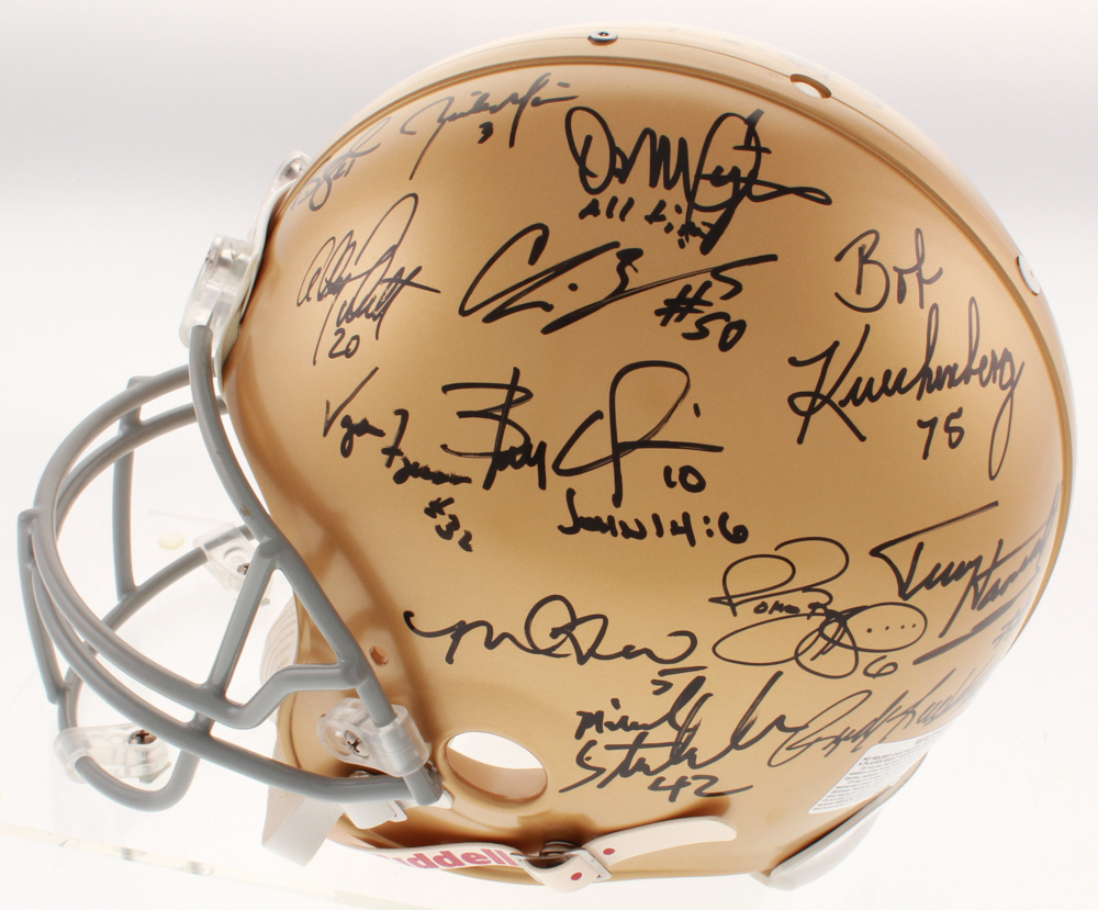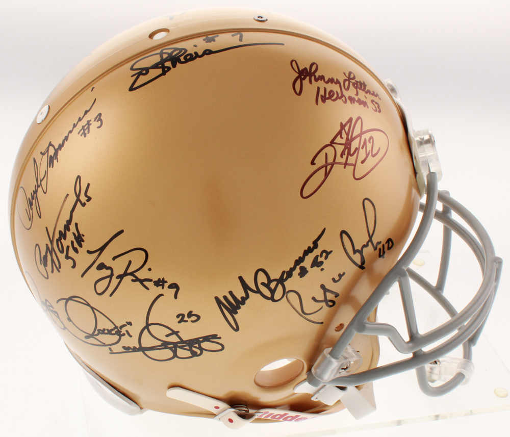 Riddell Notre Dame Fighting Irish full-size authentic on-field helmet. Hand-signed in black felt-tip pen by (22) including Joe Theisman, Johnny Lattner, Paul Hornung, Raghib "Rocket" Ismail, Bob Kuechenberg, Rudy Ruettiger, Daryle Lamonica, and (15) others. The helmet is affixed to a clear acrylic display base.