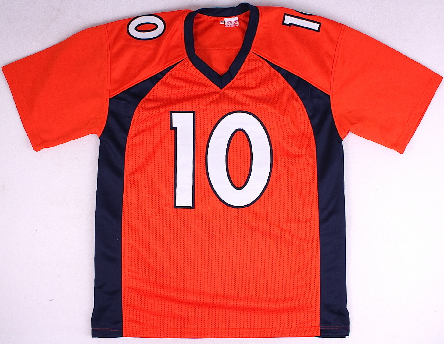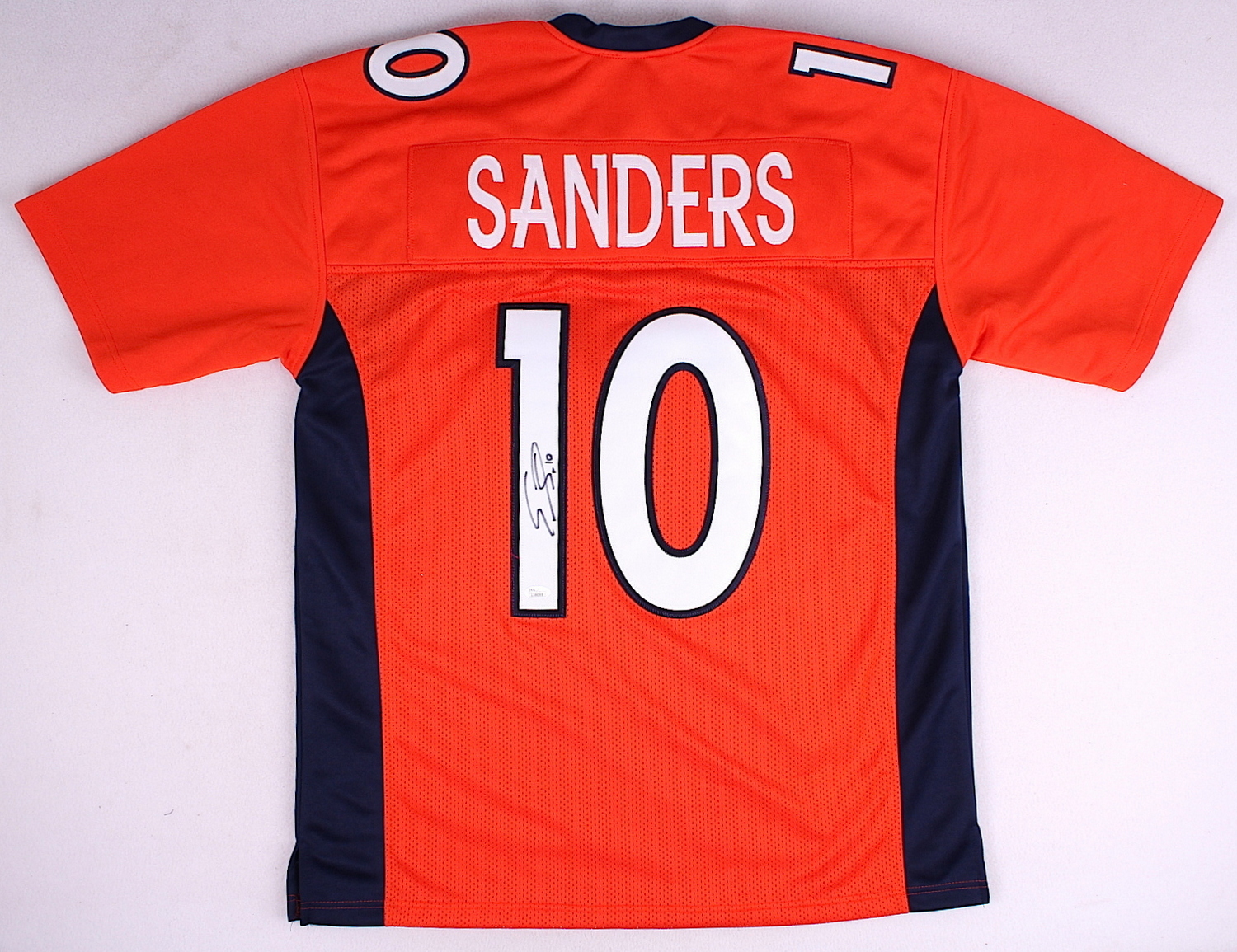 Custom on-field style jersey. Everything is sewn on, size XL. Hand-signed in black felt tip pen by Emmanuel Sanders. The autograph includes an official James Spence Authentication (JSA) hologram and matching COA for authenticity purposes.