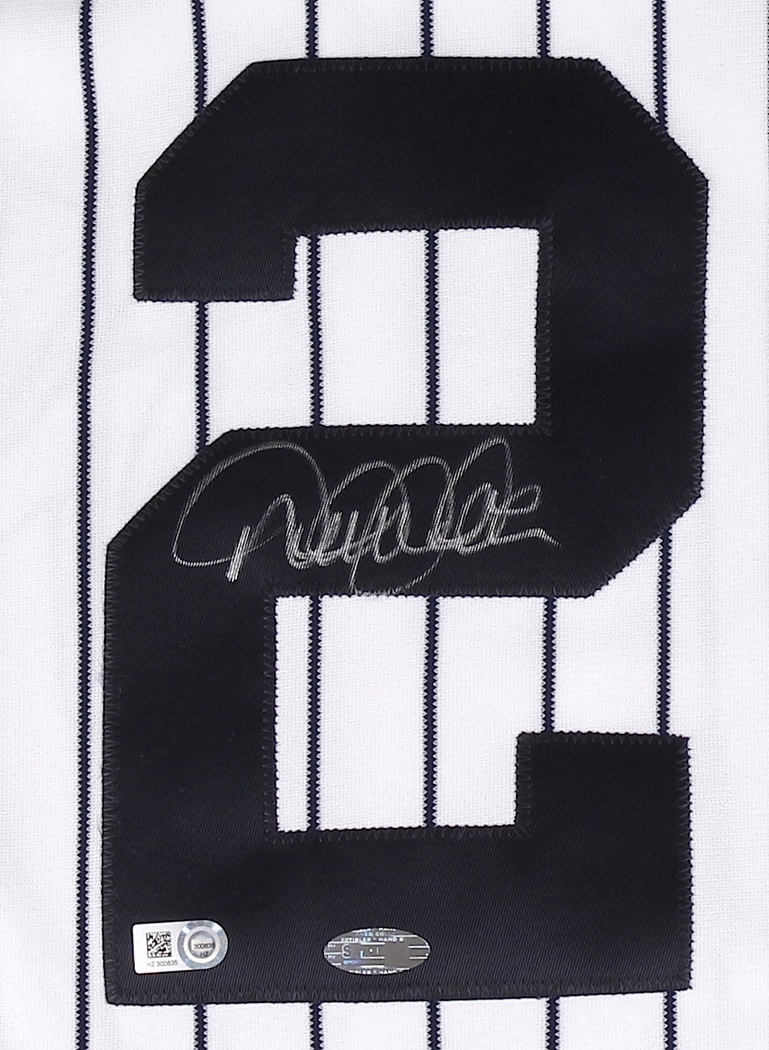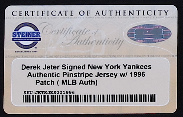 Magestic authentic jersey with 1996 World Series patch. Everything sewn on, size 44. Hand-signed in silver paint pen by Derek Jeter. The autograph includes an official MLB Authentication hologram and Steiner hologram and matching COA for authenticity purposes.