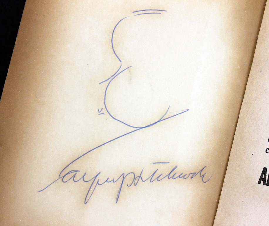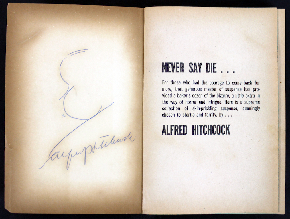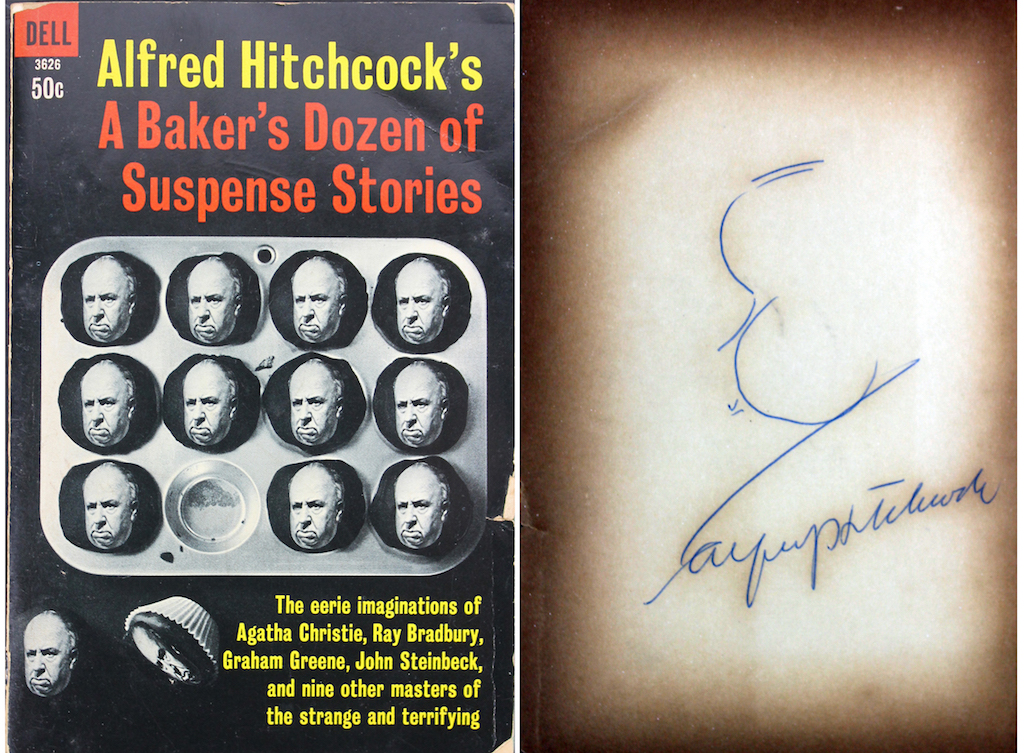 Alfred Hitchcock Signed "Alfred Hitchcock: A Baker's Dozen of Suspense Stories" hardcover book. Hand-signed in blue ink pen by Alfred Hitchcock (D. 1980).