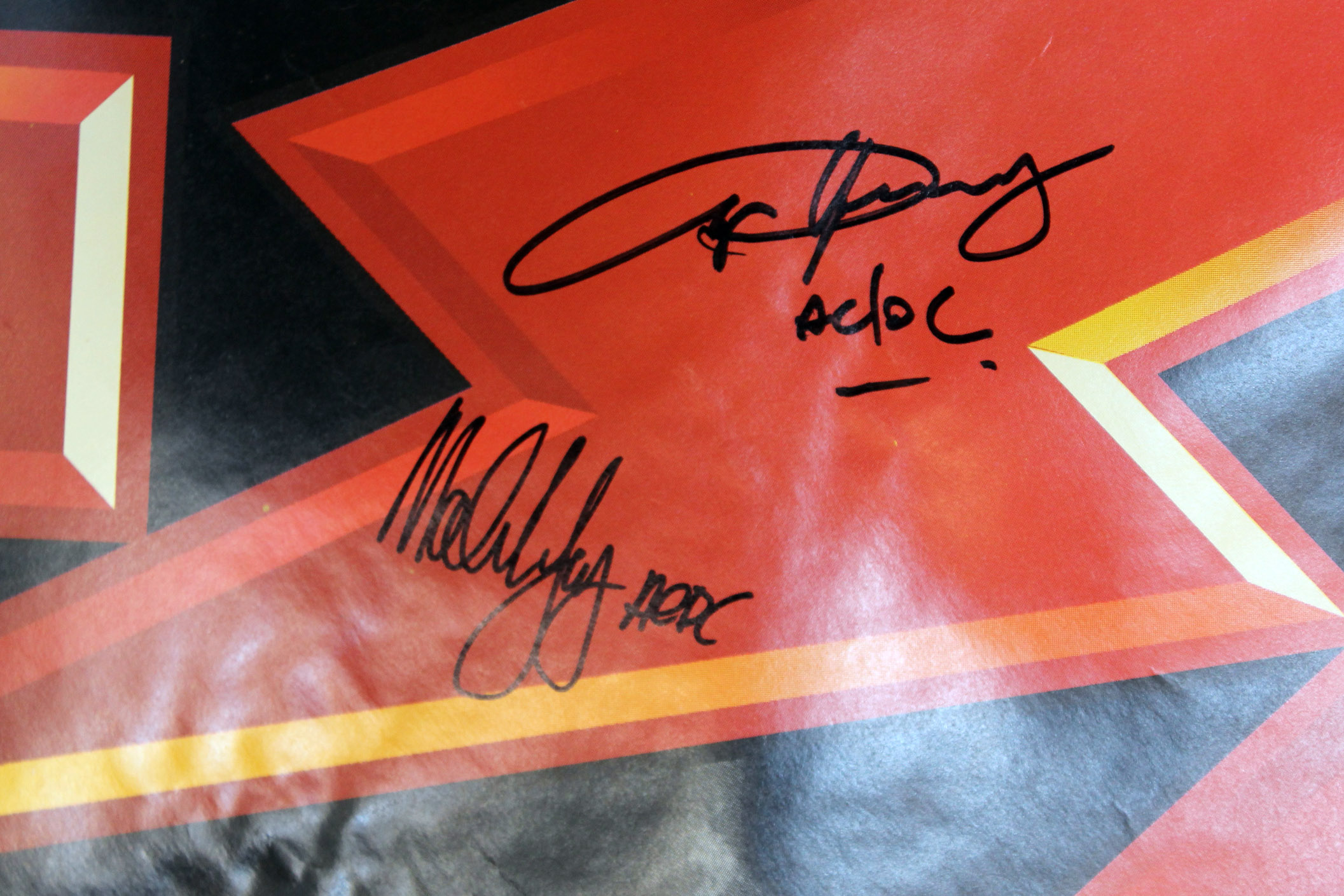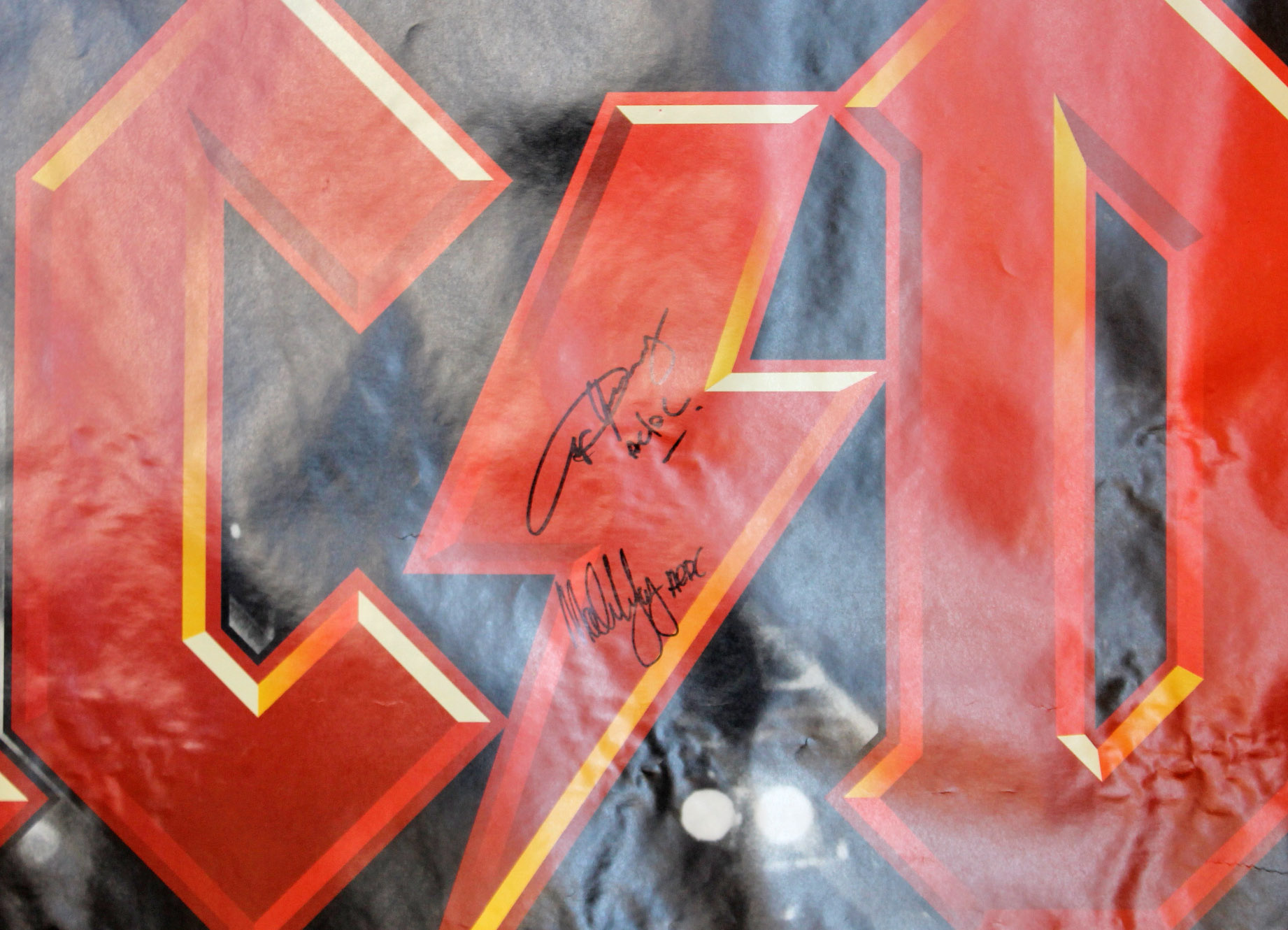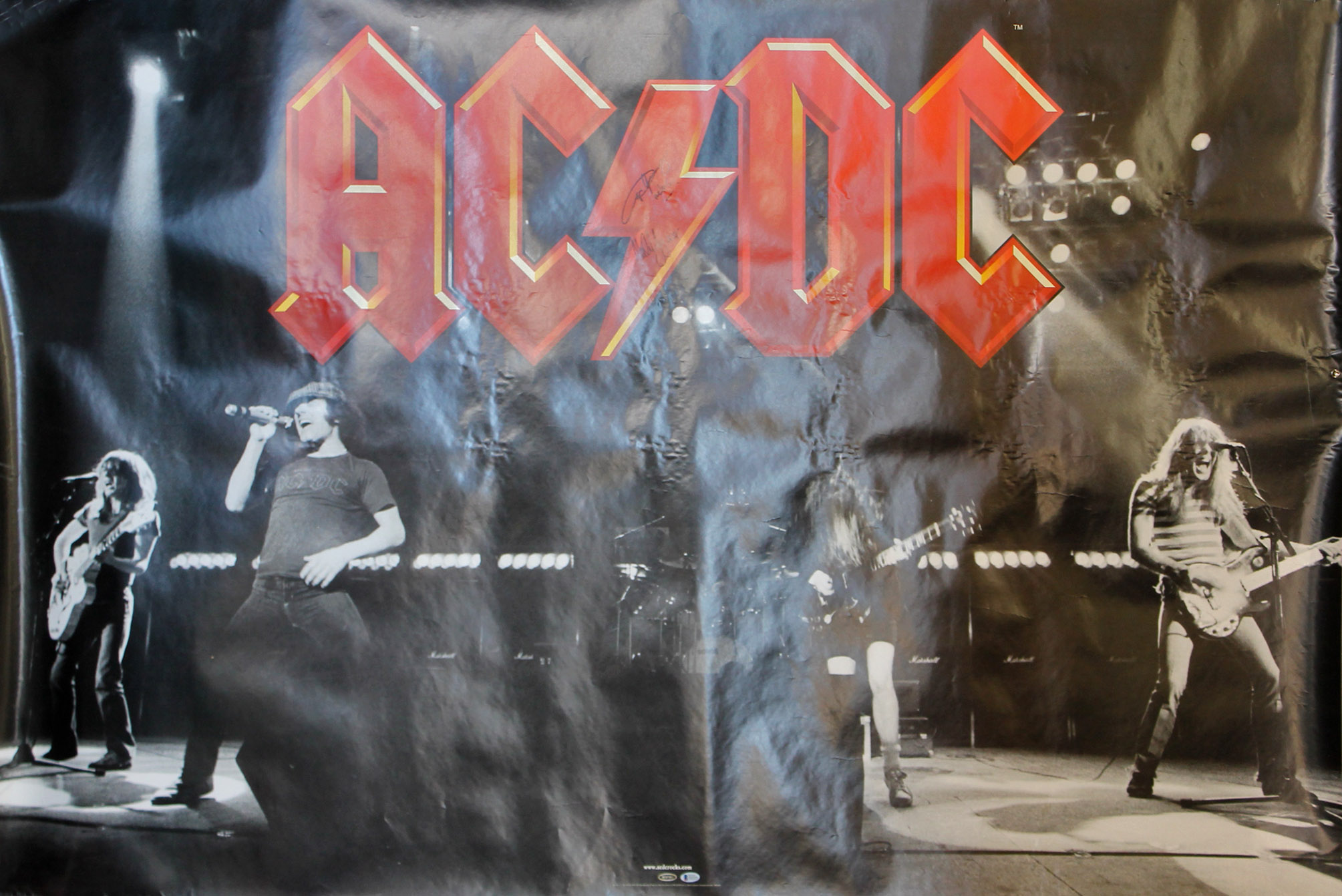 Poster measures 48" x 72" in size and has been hand-signed in black felt-tip pen by Angus Young and Malcolm Young.