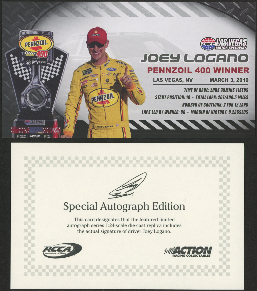 Joey Logano Signed 2019 NASCAR #22 Pennzoil - Las Vegas Win - Raced Version - 1:24 Premium Action Diecast Car (Action COA)