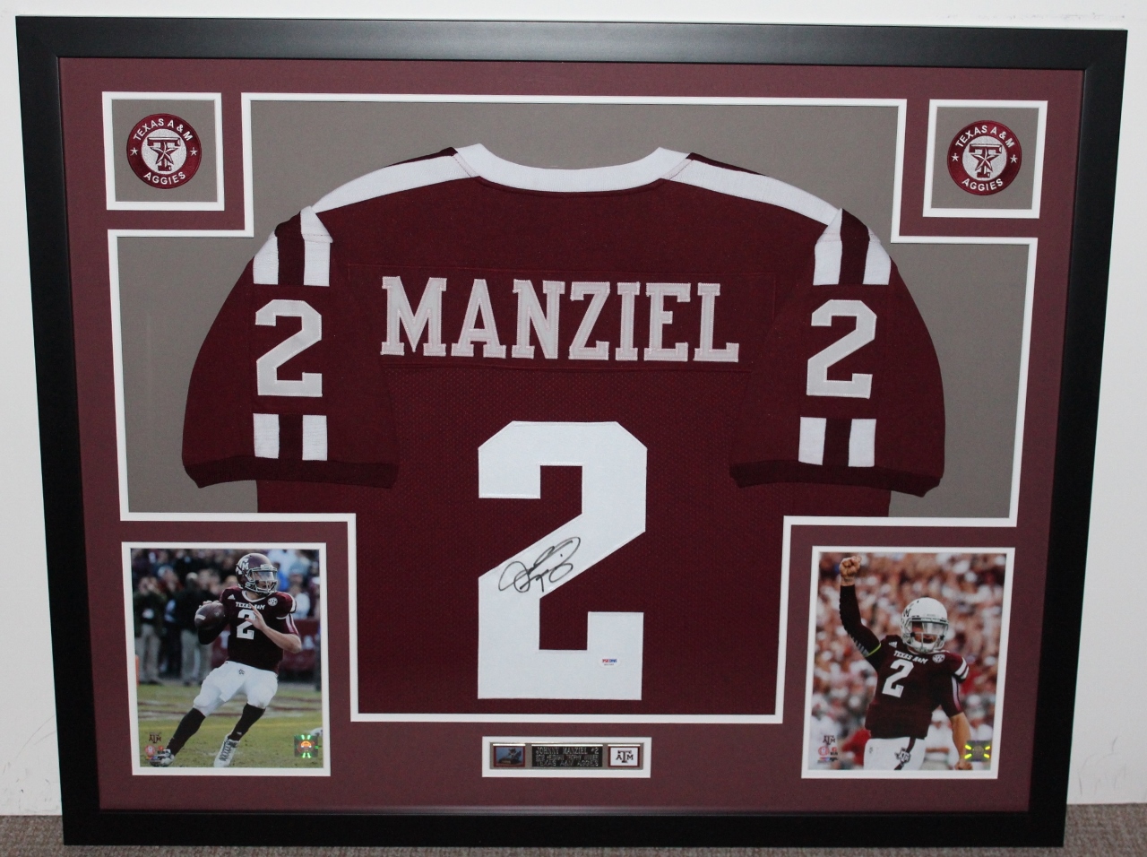 A beautifully framed autographed Johnny Manziel Texas A&M Aggies Jersey. The autograph was certified by PSA and includes a sticker on the Jersey and a matching certificate attached to the back of the frame.