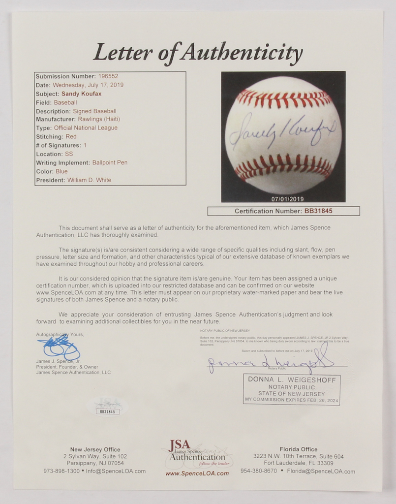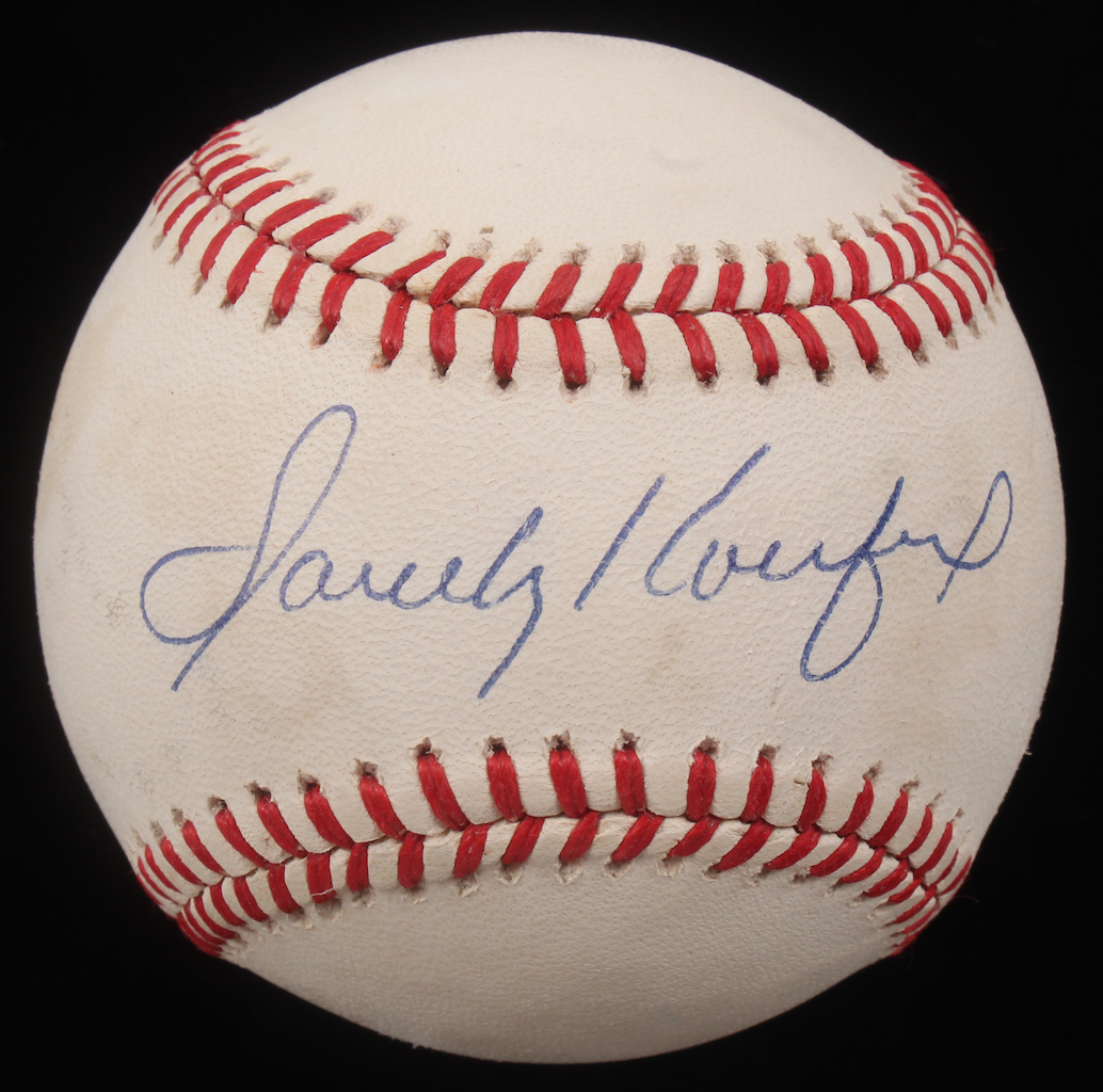 Rawlings Official National League Baseball. Baseball has been hand-signed in blue ink pen by Sandy Koufax (Los Angeles Dodgers, HOF). Please note, the baseball shows signs of natural toning.