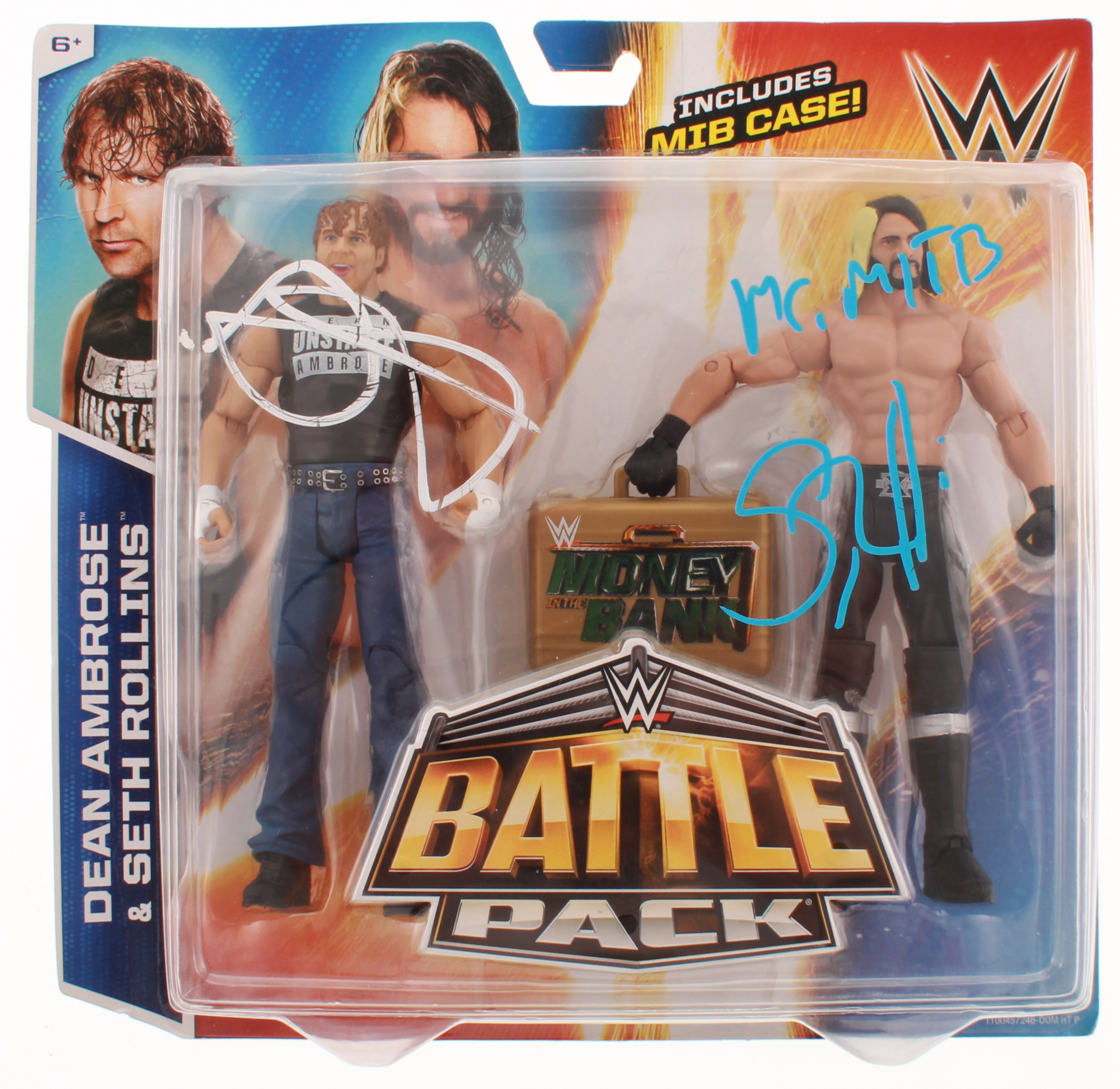 Dean Ambrose & Seth Rollins Signed WWE Battle Pack Figurine Set Packaging Inscribed "Mr. MITB" (JSA COA)