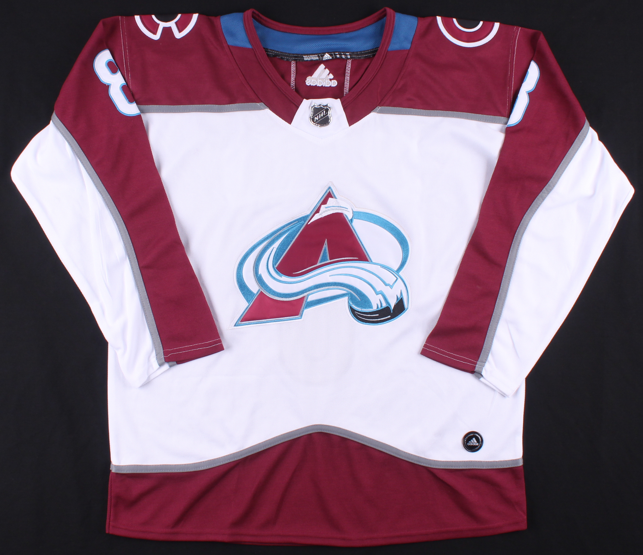 Adidas on-ice style jersey. Everything is sewn on, size 52. Hand-signed in silver paint pen by Cale Makar.
