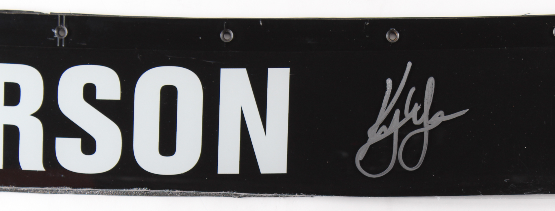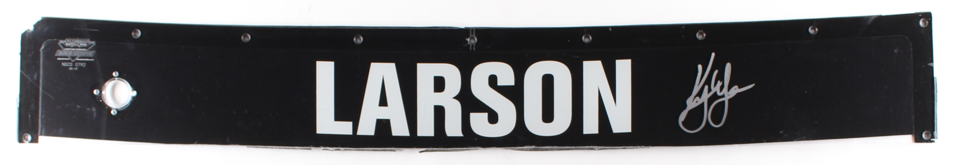 This race-used windshield nameplate measures approximately 45" x 6" in size and is hand-signed in silver paint pen by Kyle Larson. The piece comes directly from Kyle Larson's car raced in NASCAR event.