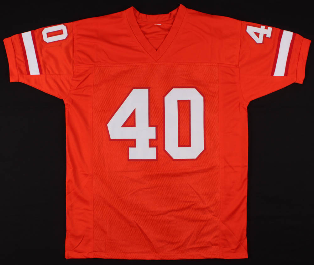 Custom on-field style jersey. Everything is sewn on, size XL. Hand-signed and inscribed in black felt-tip pen by Mike Alstott.