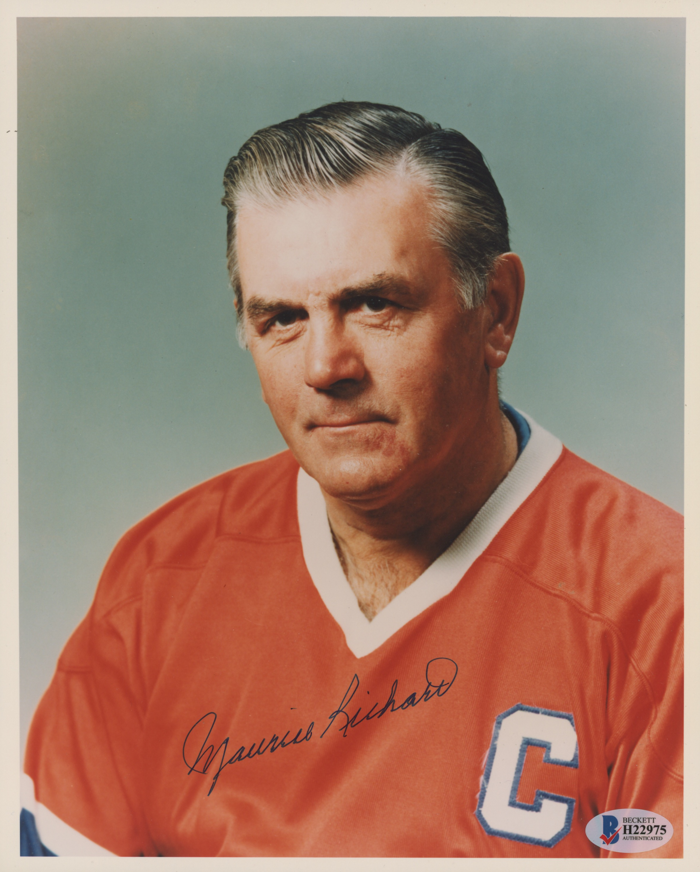 Photo measures 8" x 10" in size and has been hand-signed in blue ink pen by Maurice Richard (D. 2000, HOF).