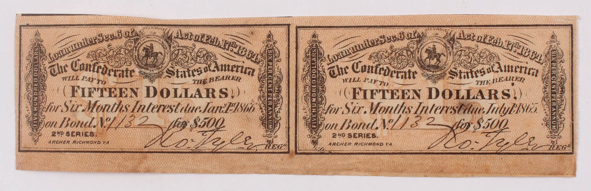 Uncut Sheet of (2) 1864 $15 Fifteen Dollar Confederate States of America Richmond CSA Bank Note Bonds