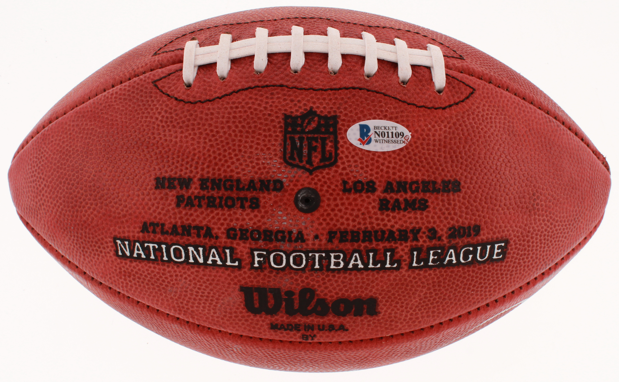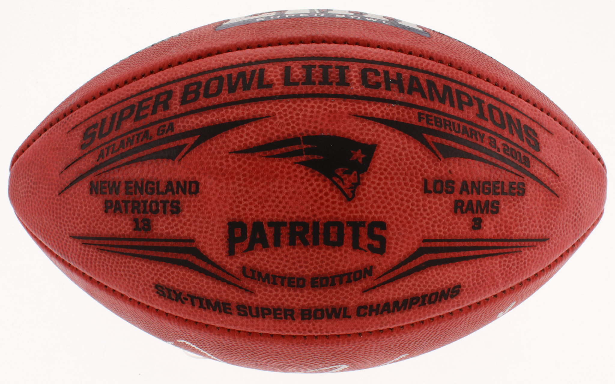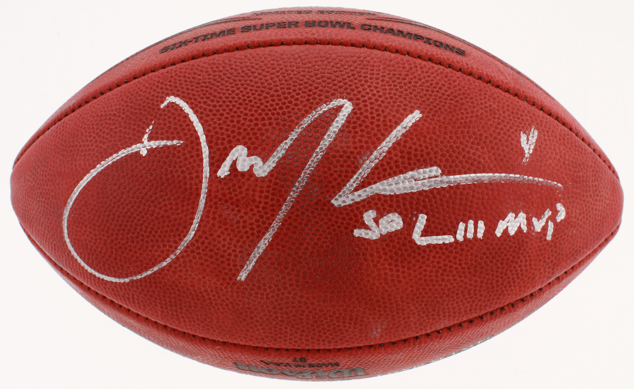 Wilson "Official Super Bowl LIII Logo NFL Game football. Hand-signed and inscribed in silver paint pen by Julian Edelman (New England Patriots).