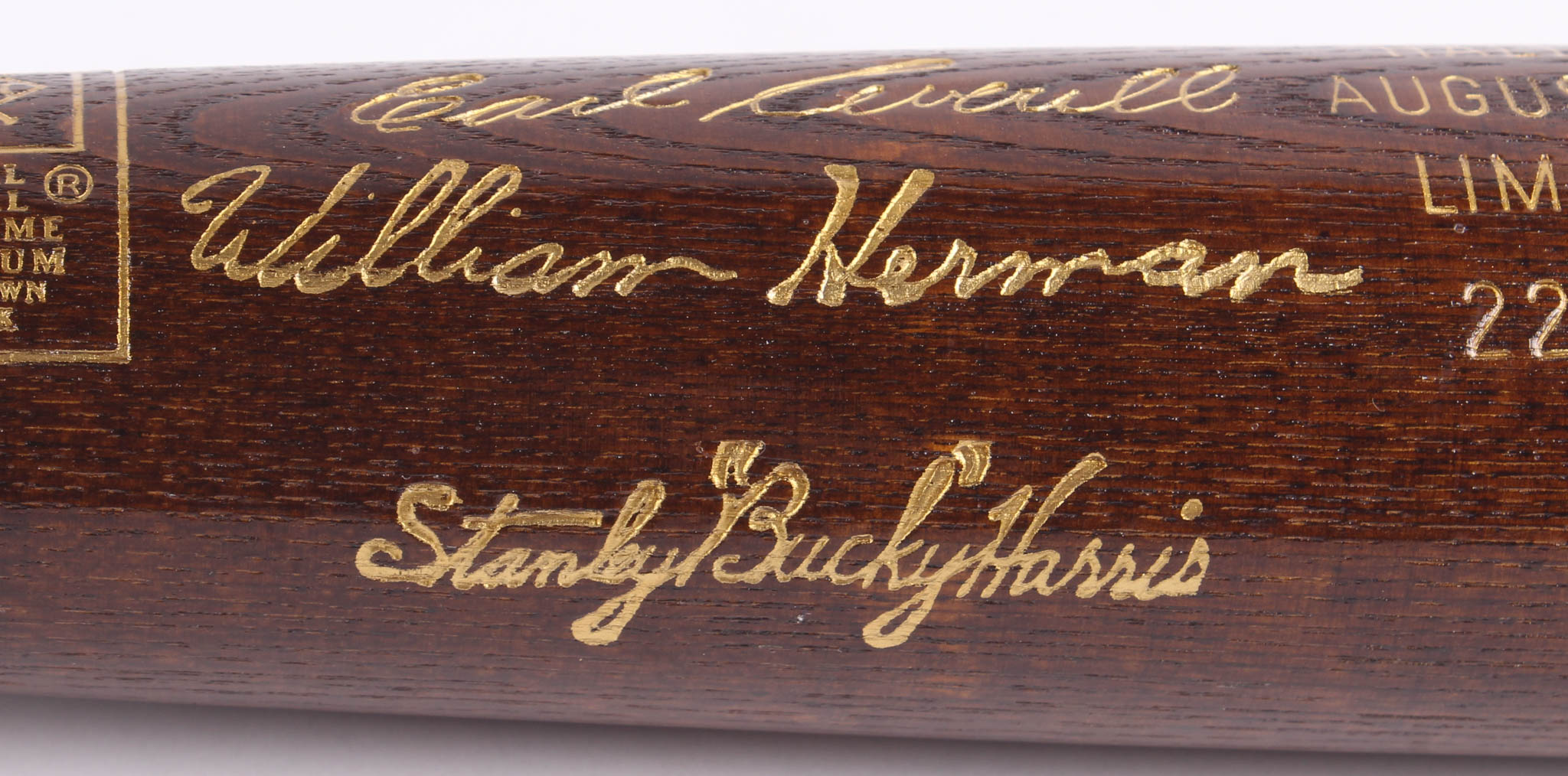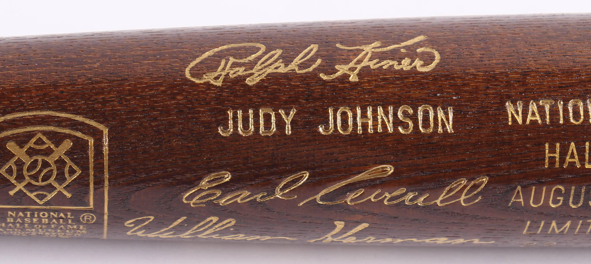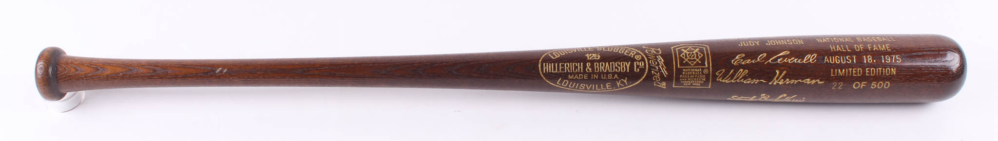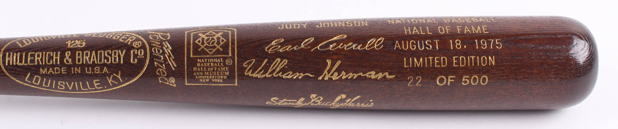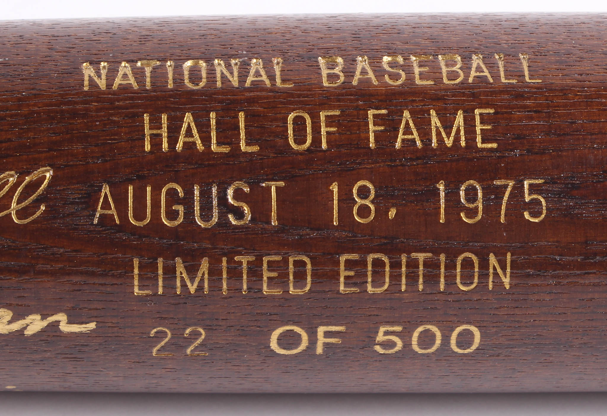 Louisville Slugger National Baseball Hall of Fame Inaugural Class of 1975 Engraved Baseball Bat. Please note, the bat includes engraved signatures and is not autographed. Bat has been engraved limited edition #22/500.