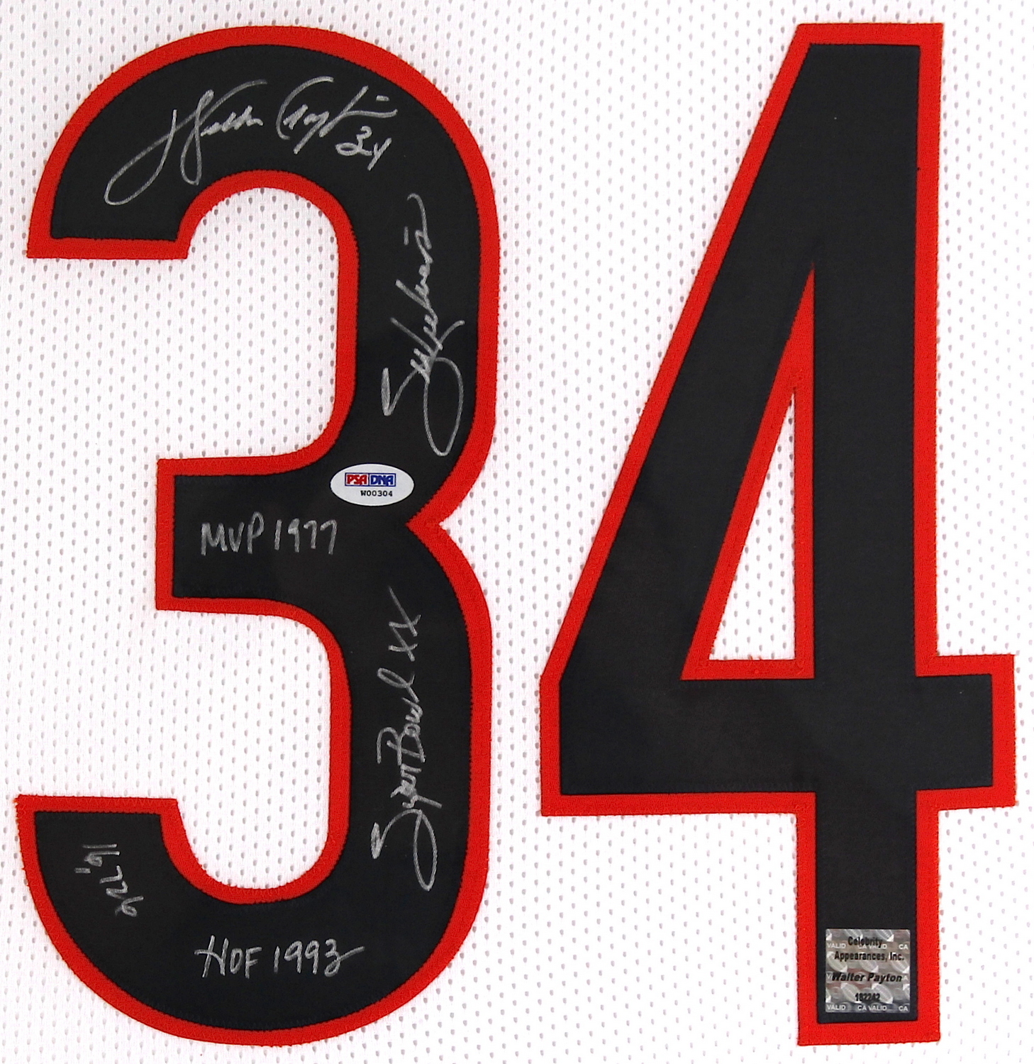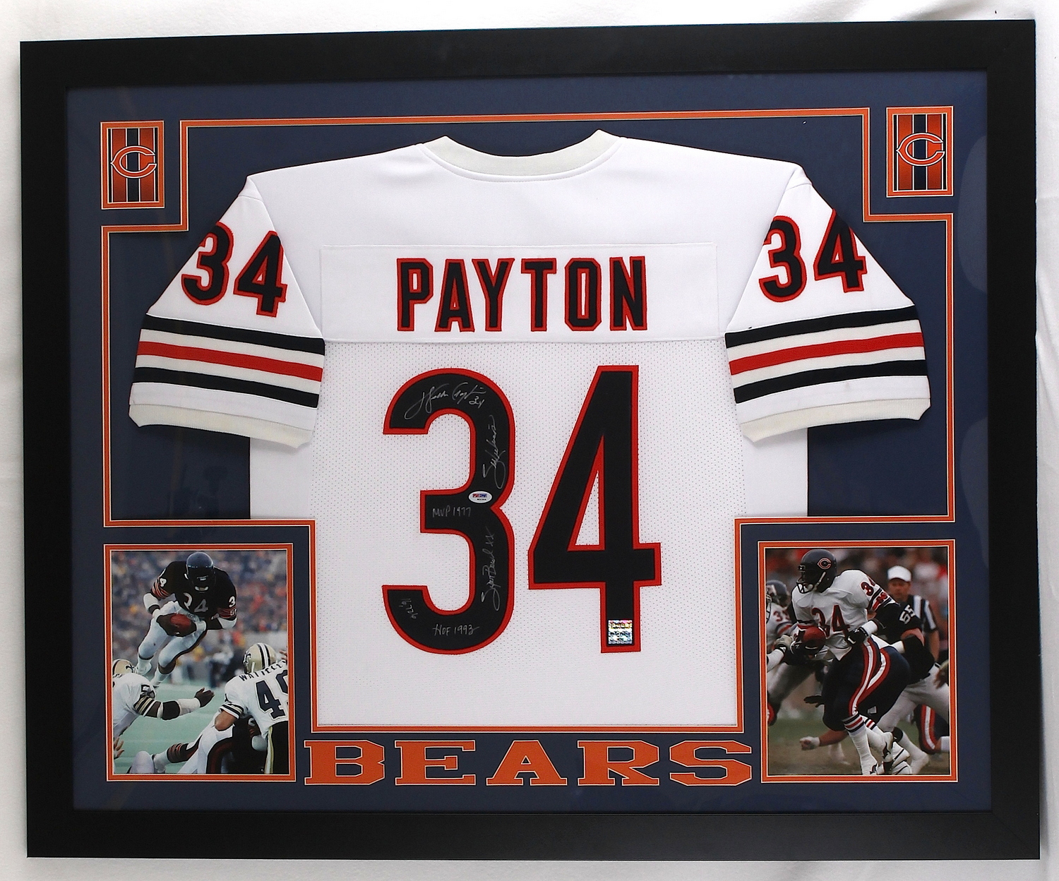 Custom frame measures approximately 35" x 43" in size and features a jersey which has been hand-signed and inscribed in silver paint pen by Walter Payton (D 1999, HOF). The autograph includes an official PSA/DNA hologram and a Walter Payton hologram for authenticity purposes.