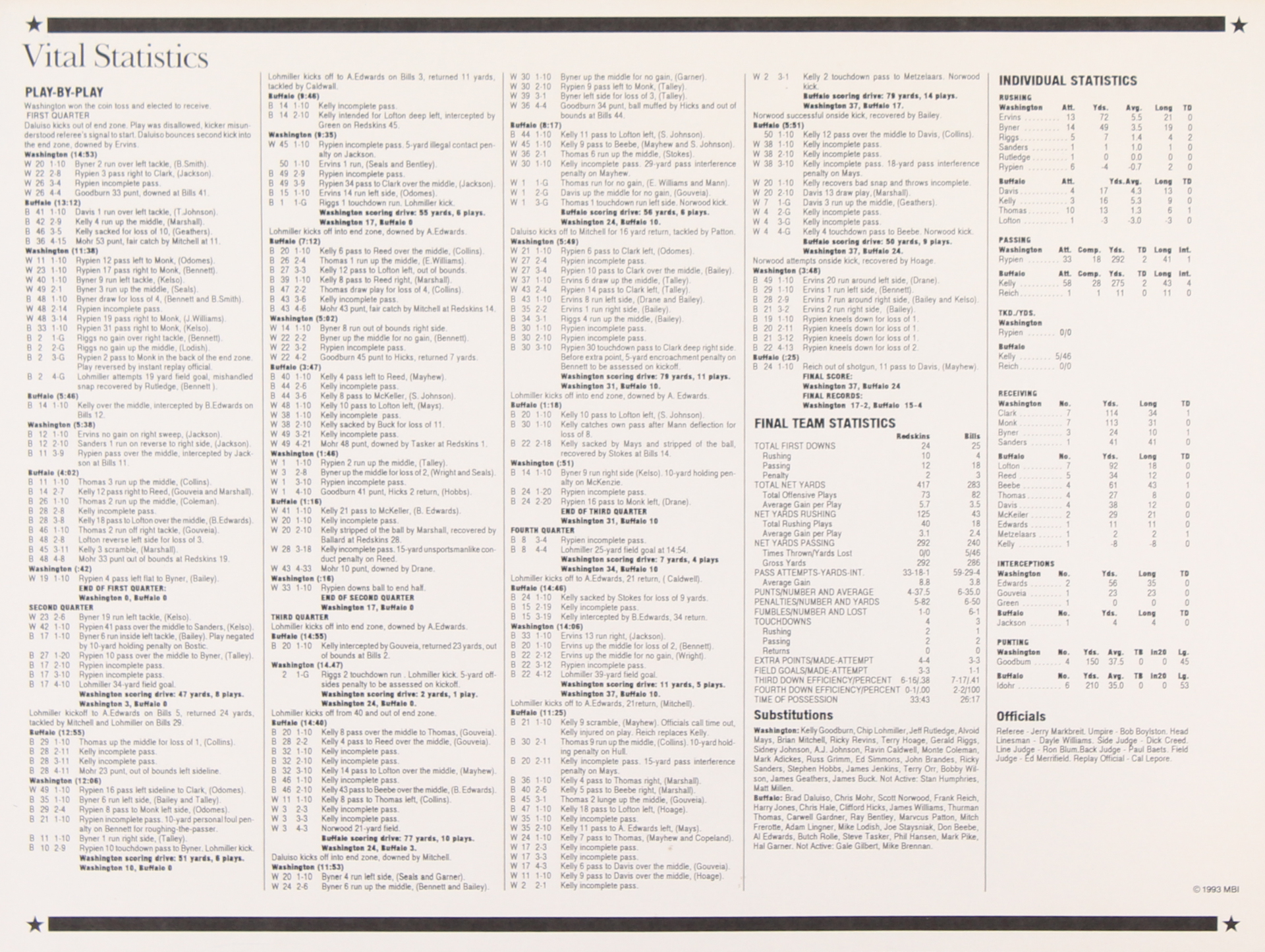 Commemorative Super Bowl XXVI Score Card With Patch: Redskins vs. Bills