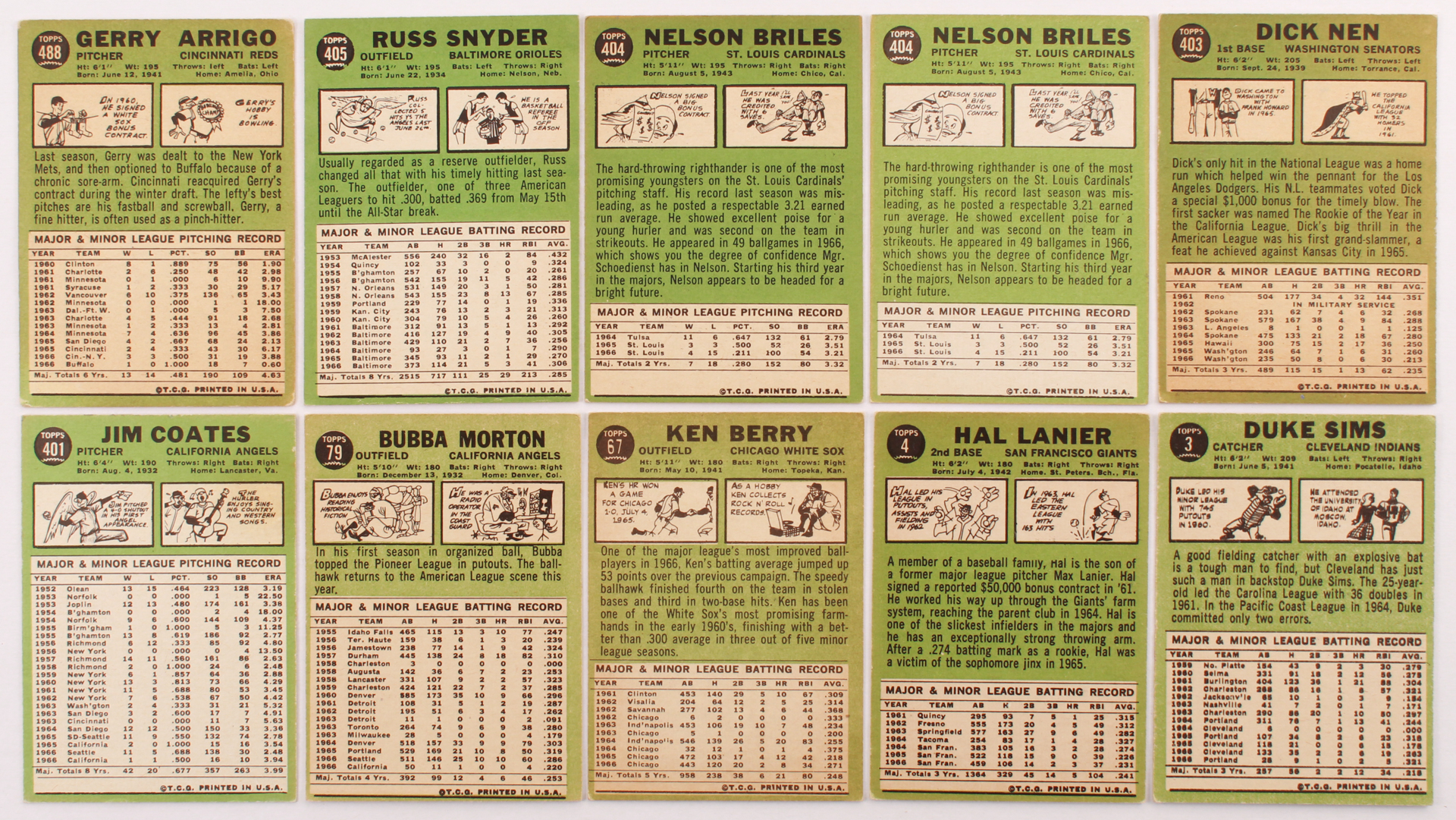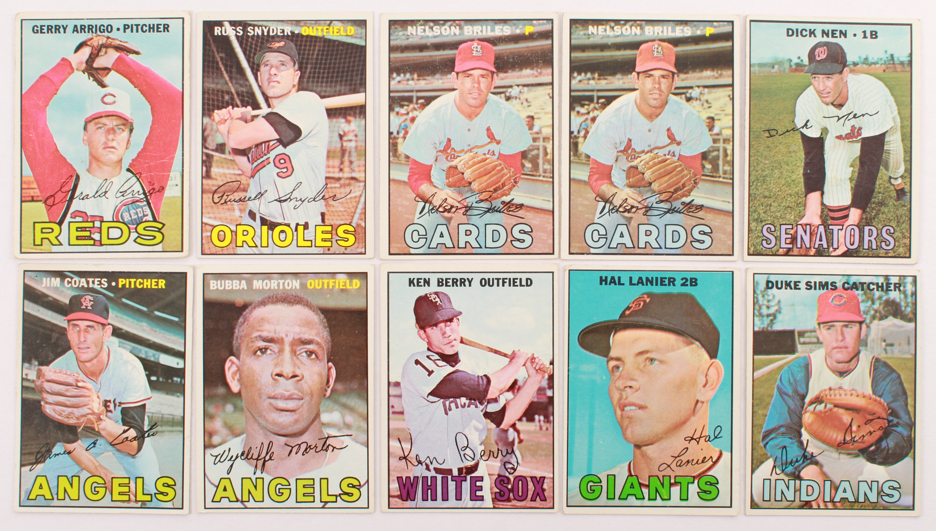 Lot of (10) 1967 Topps Baseball Cards with #404 Nelson Briles, #488 Gerry Arrigo, #405 Russ Snyder, #403 Dick Nen