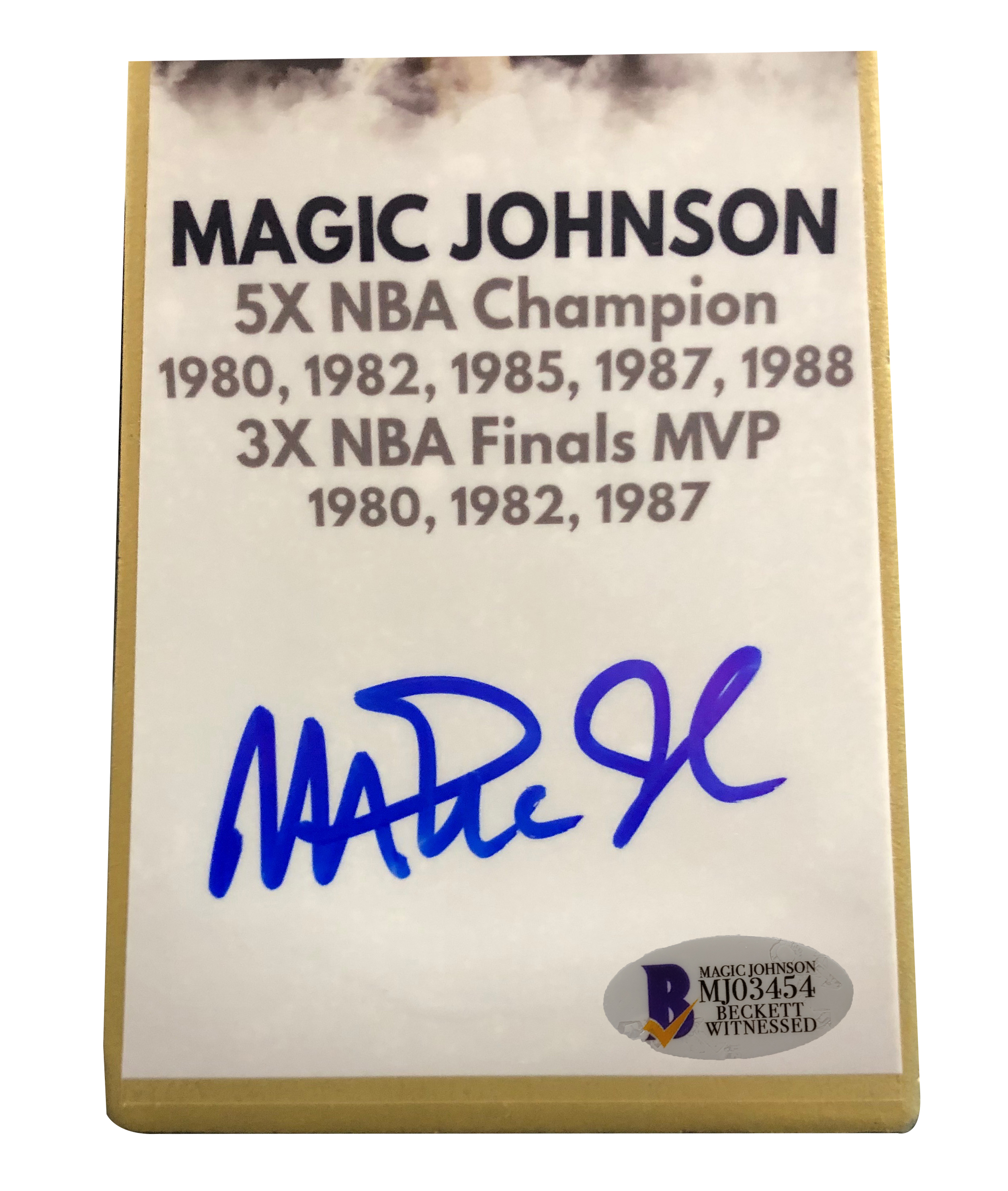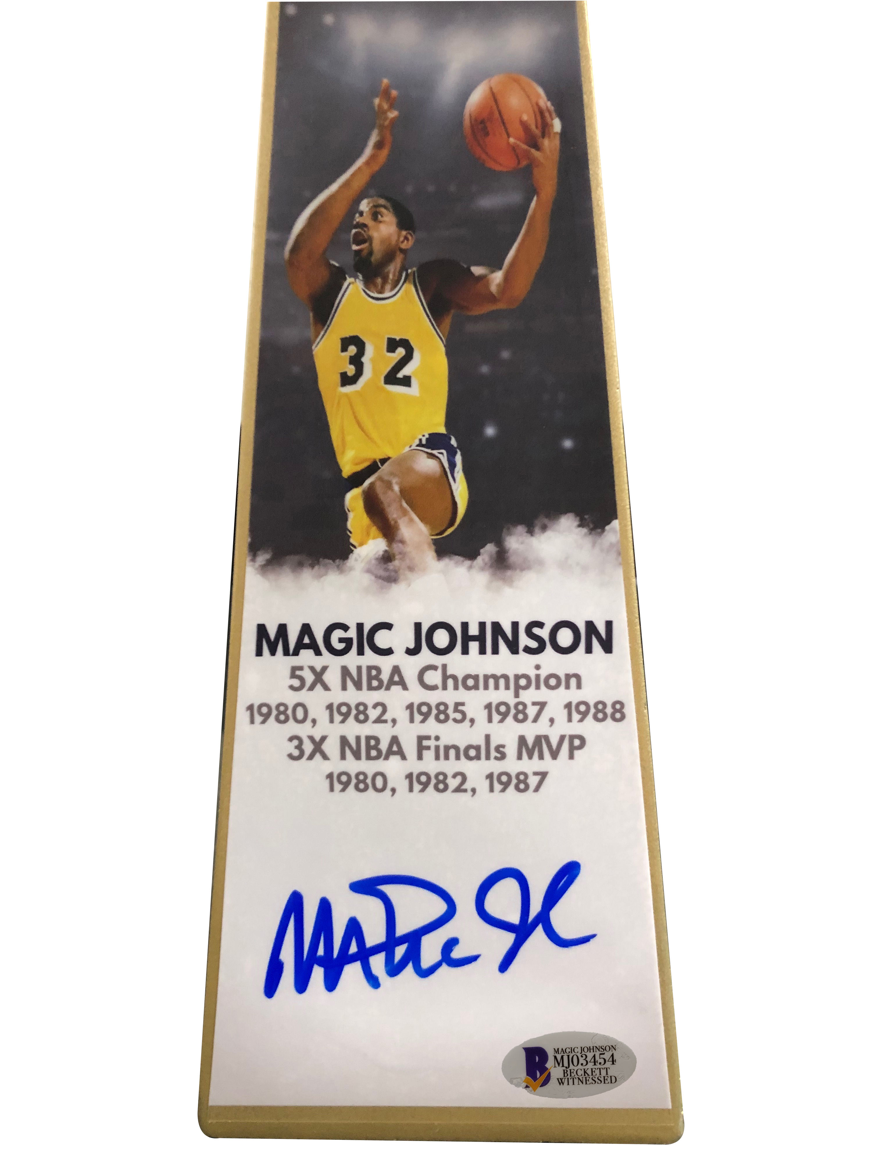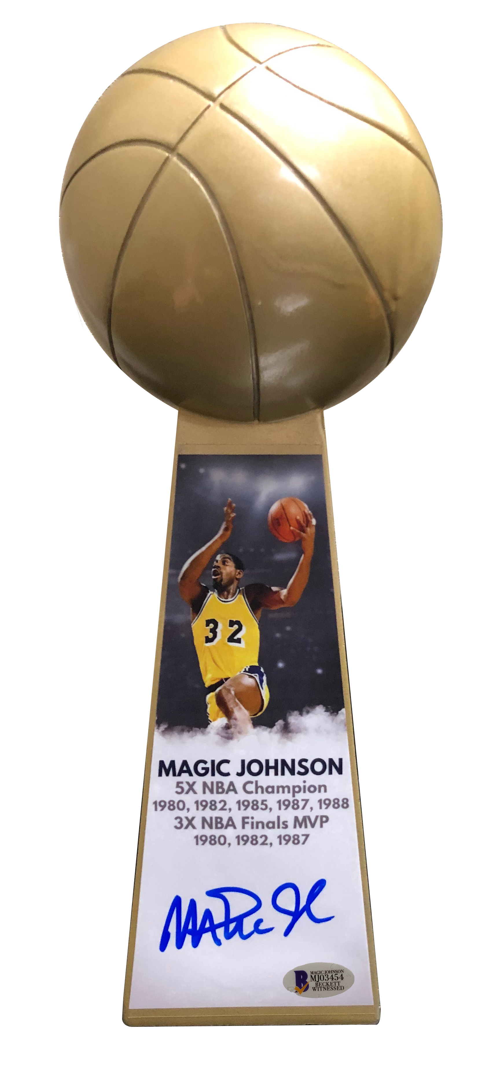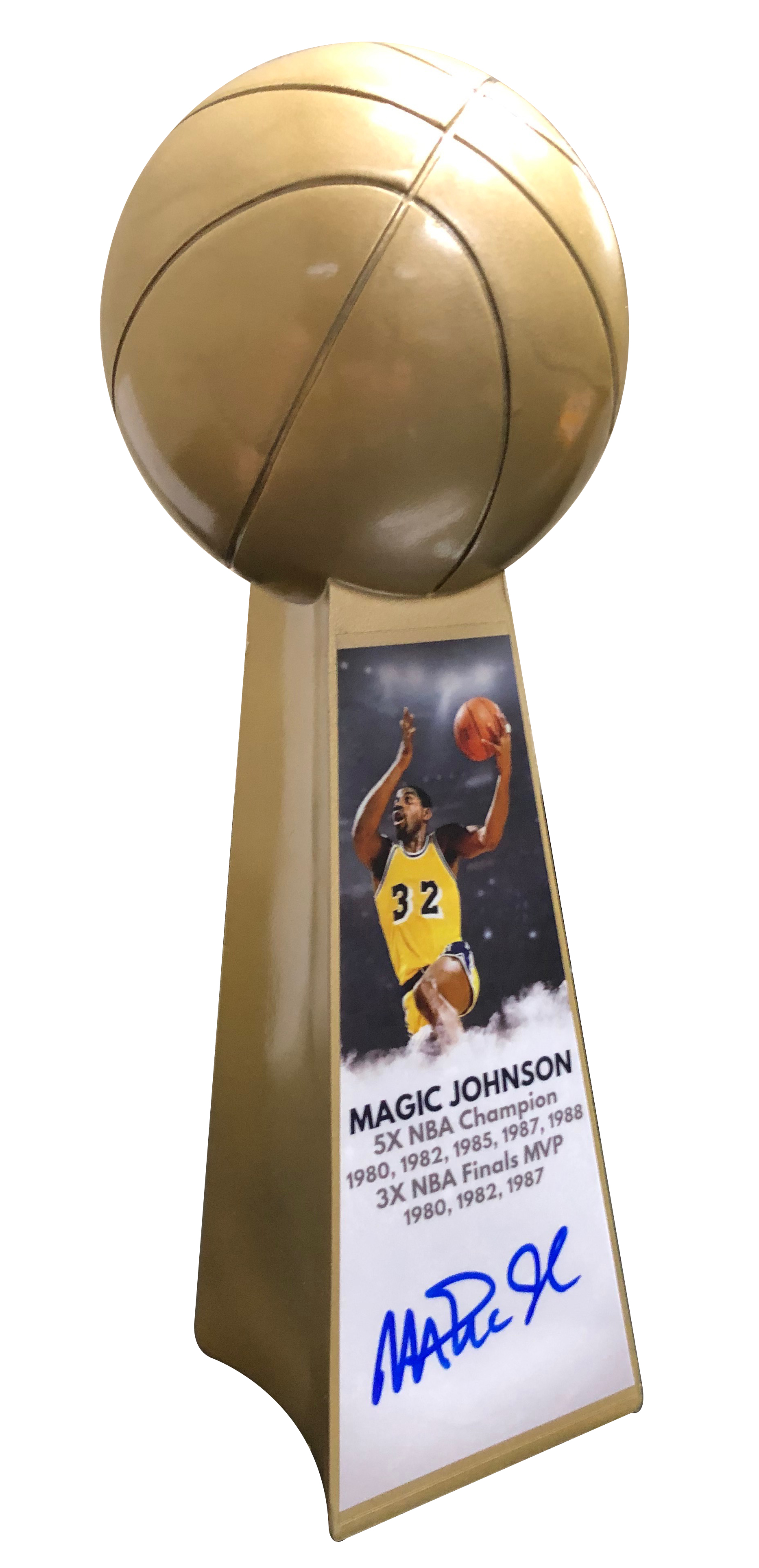 This gold Larry O'Brien NBA championship commemorative trophy measures approximately 14" in height. Hand-signed in blue felt-tip pen by Magic Johnson (Lakers, HOF).