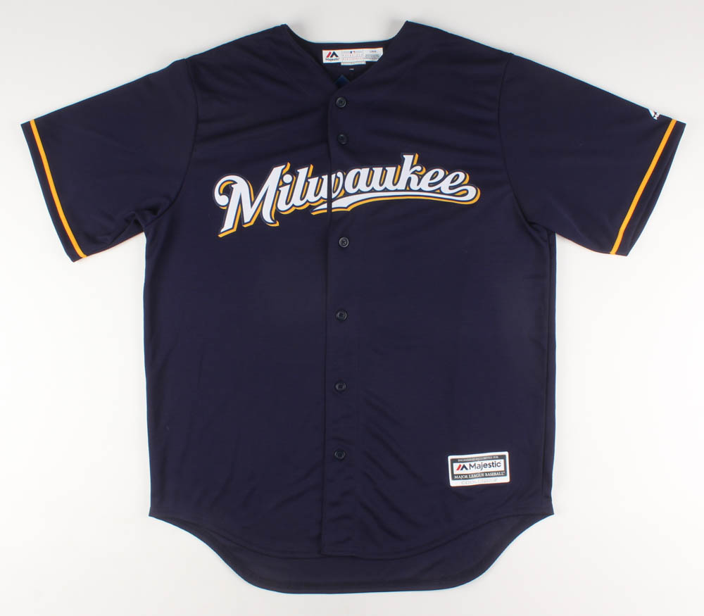 Majestic on-field style jersey. Everything sewn on, size L. Hand-signed in gold paint pen by Christian Yelich.