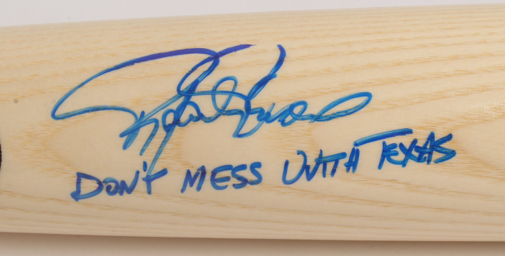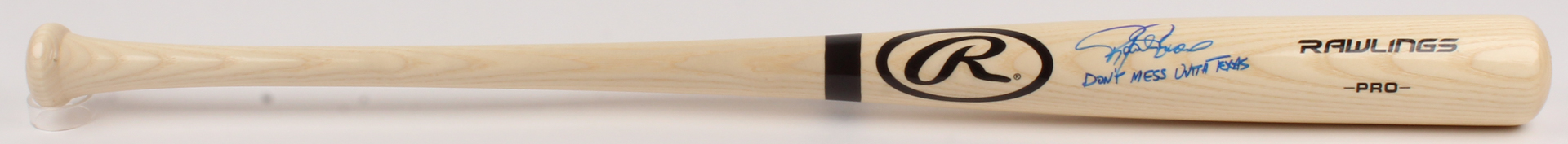 Rawlings Pro Baseball Bat has been hand-signed in blue felt-tip pen by Rafael Palmeiro. (Texas Rangers)