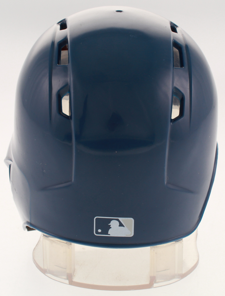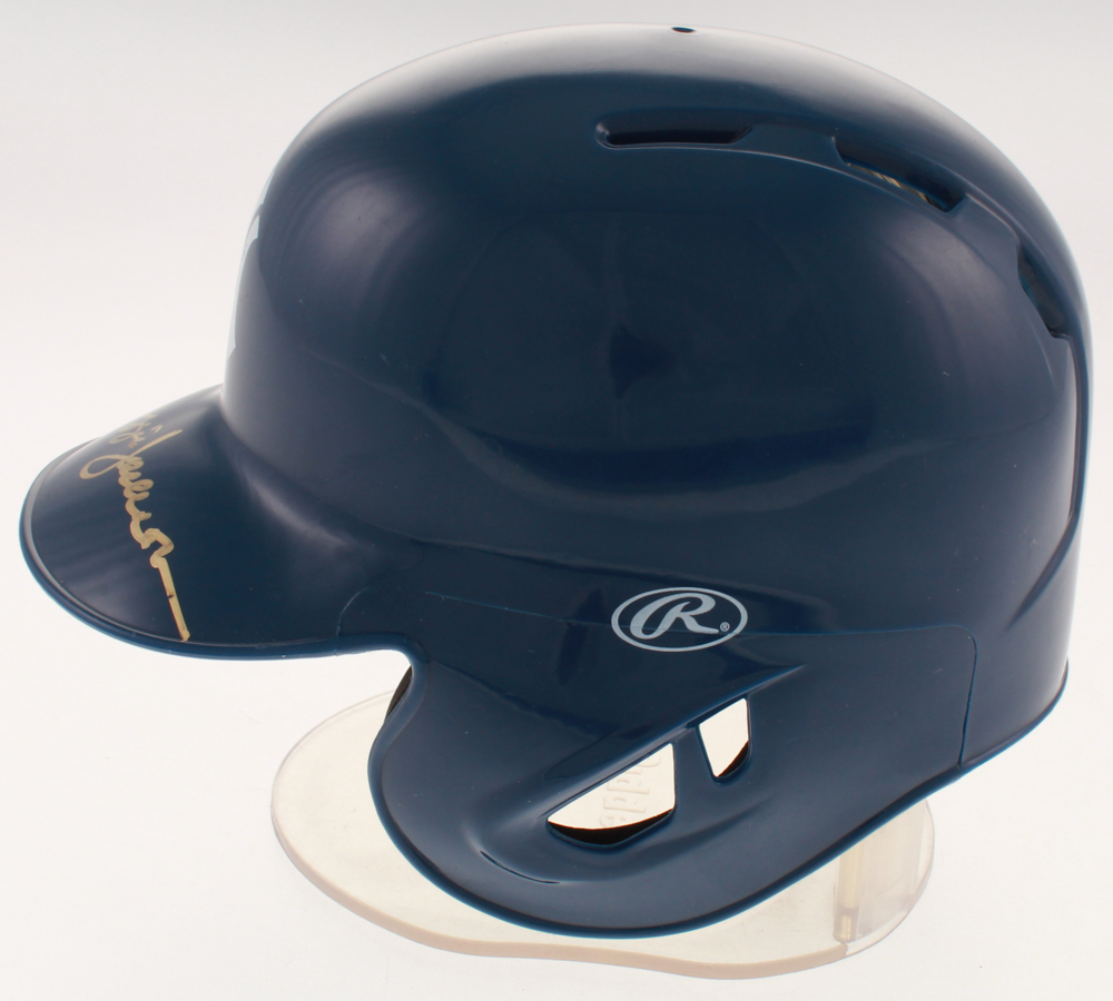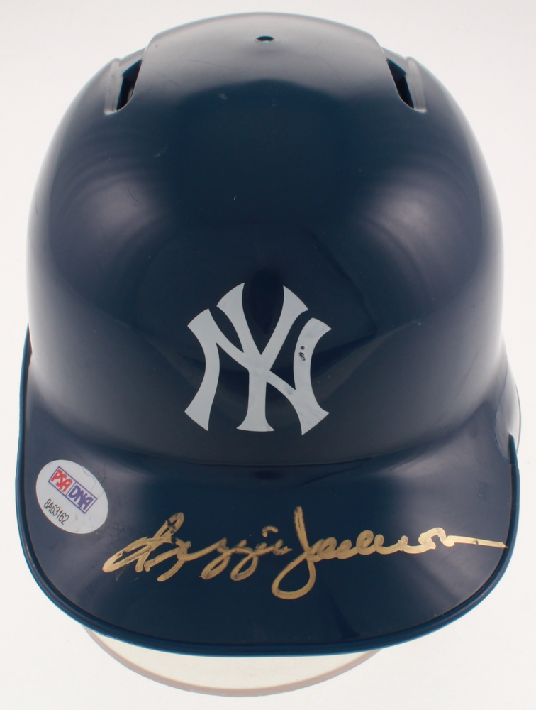 Rawlings New York Yankees mini batting helmet. Hand-signed in gold paint pen by Reggie Jackson (HOF).