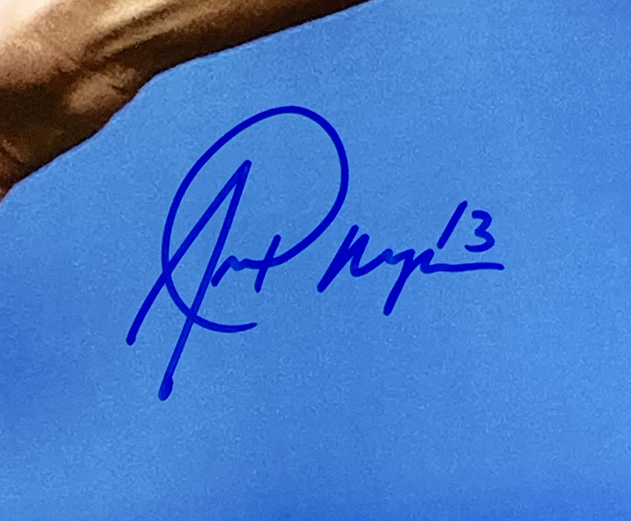 Photo measures 16" x 20" in size and has been hand-signed in blue felt-tip pen by Alex Morgan.