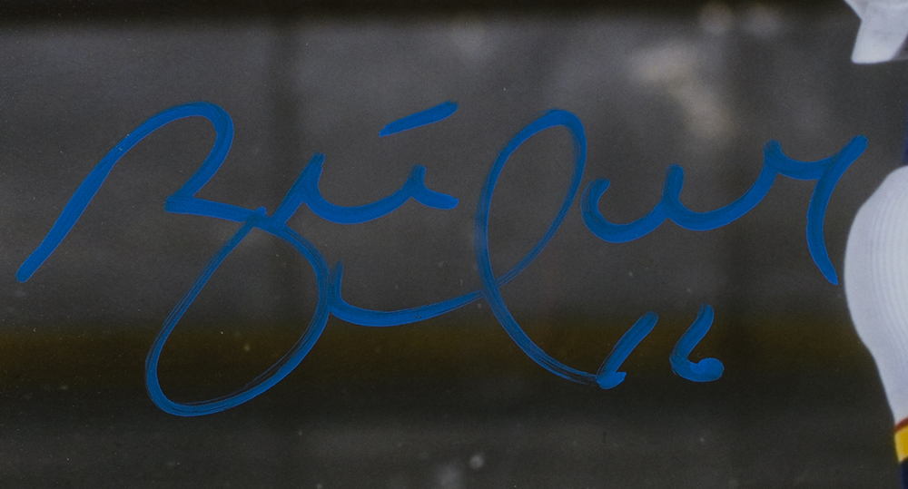 Custom framed display measures approximately 11" x 14" in size and features an 8" x 10" photo that has been hand-signed in blue paint pen by Brett Hull (HOF).