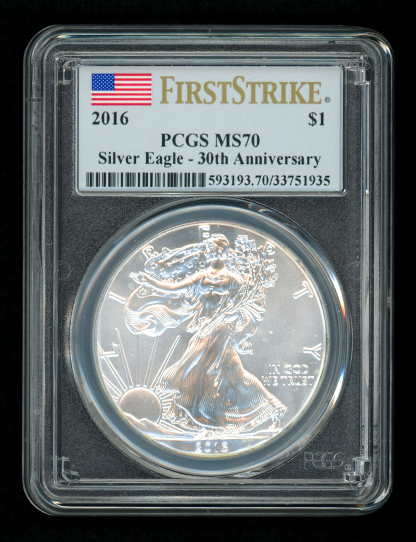 2016 American Silver Eagle $1 One Dollar Coin - First Strike, 30th Anniversary (PCGS MS70) (U.S. Flag Label)