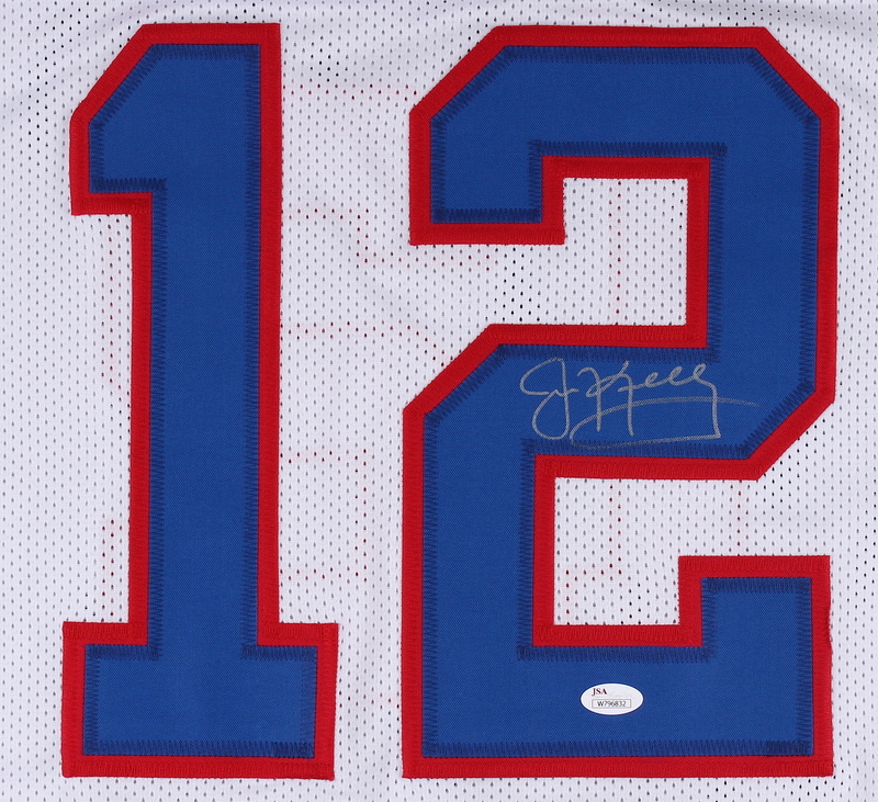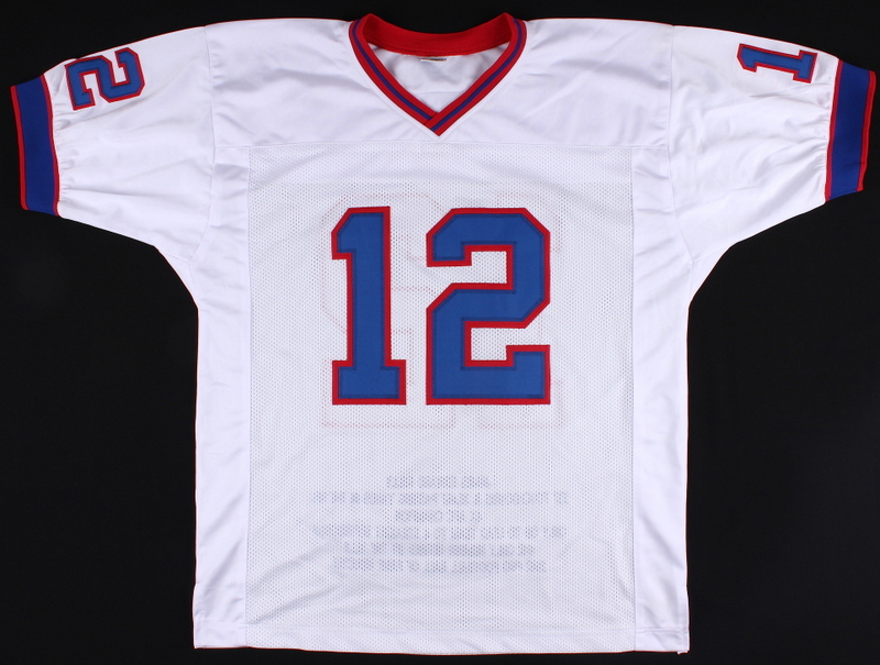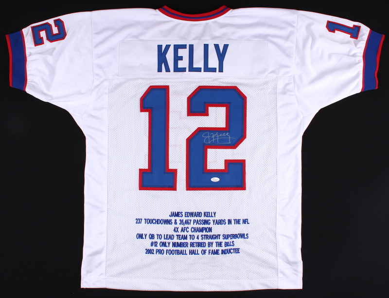 Custom on-field style jersey. Everything is sewn on, size XL. Hand-signed in silver paint pen by Jim Kelly (HOF). Kelly's career stats are custom stitched into the jersey below the reverse numbers. The autograph includes an official James Spence Authentication (JSA) hologram and matching COA for authenticity purposes. The signing was witnessed by JSA.