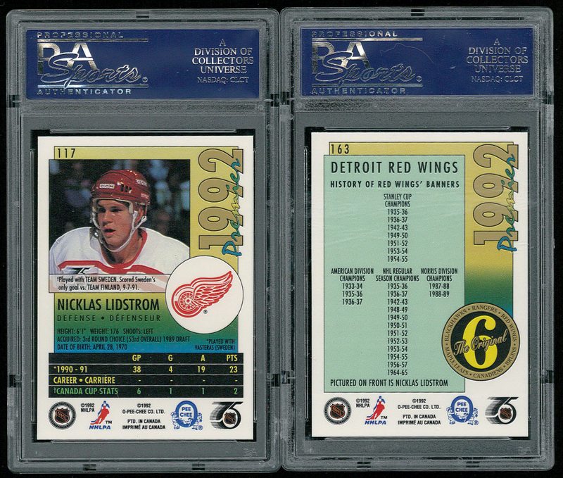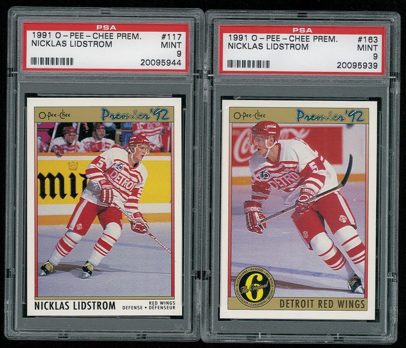 Lot of (2) Nicklas Lidstrom (Red Wings) 1991-92 OPC Premier Hockey Cards with #163 The Original 6 and #117 Rookie Card. Both cards PSA graded 9. Please see the scans below for details on the condition of the card.