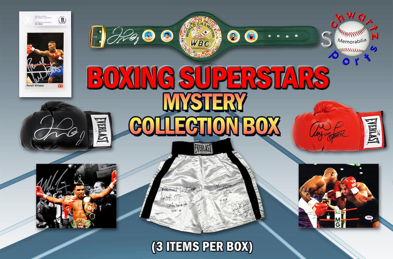 Each Boxing Collection Mystery Box contains three (3) autographed boxing items. There are over 40 different boxers included in this Series 3 Boxing Collection mystery box, which is a Pristine Exclusive edition that is limited to 100 boxes.