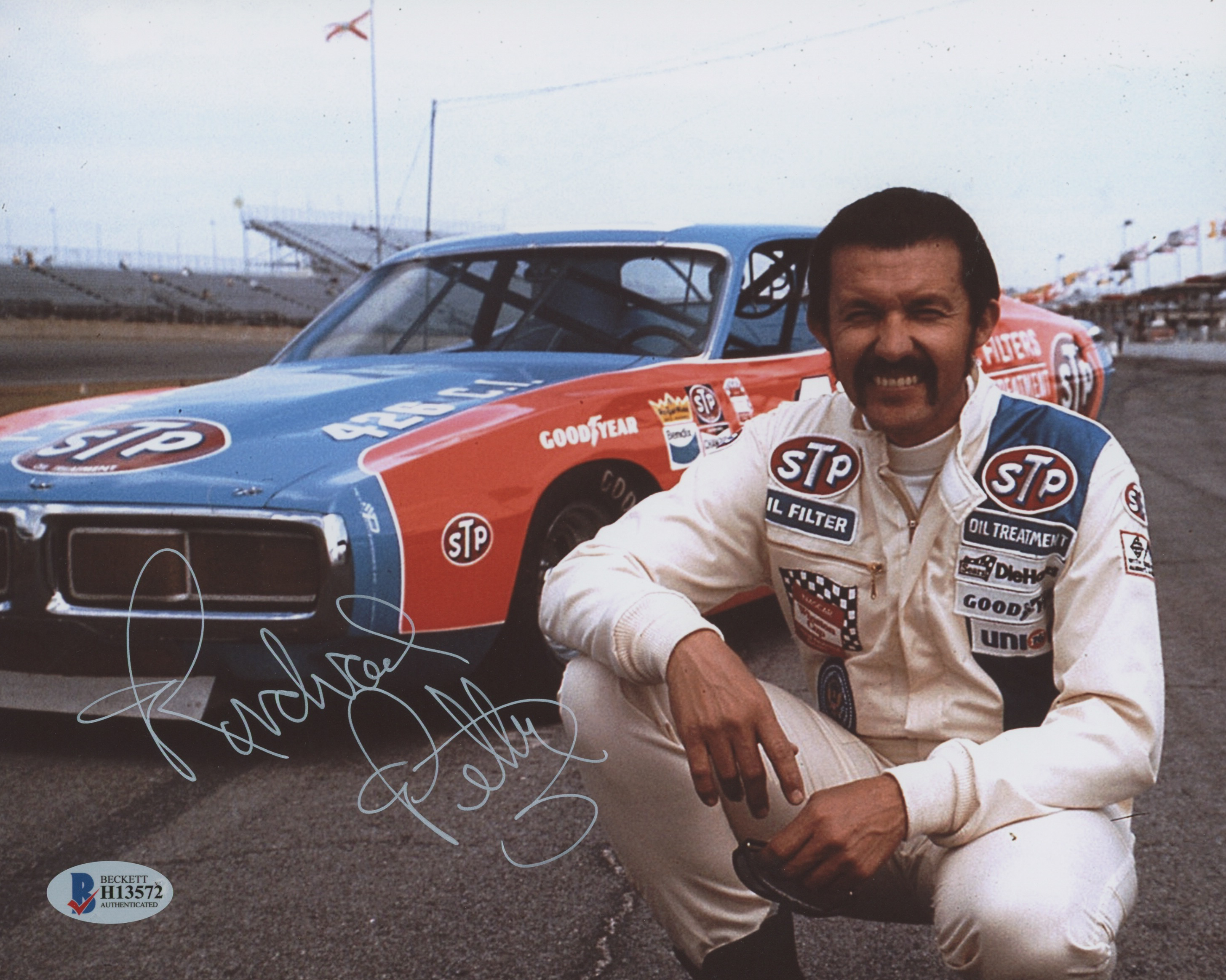 Photo measures 8" x 10" in size and has been hand-signed in white paint pen by Richard Petty (HOF).