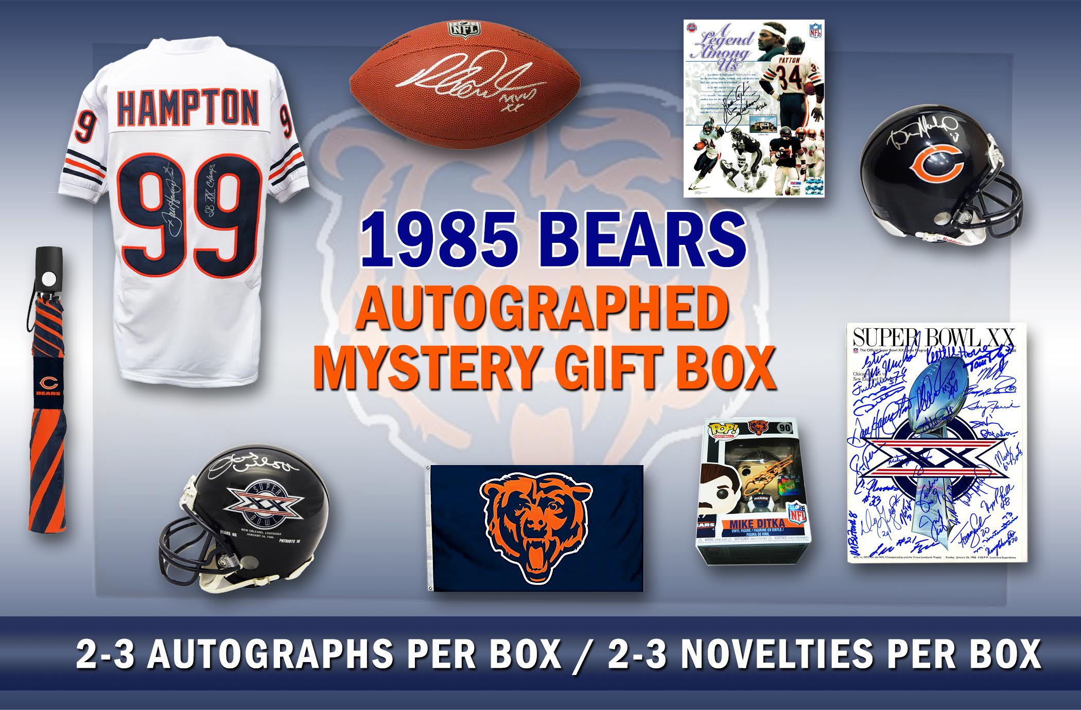Each 1985 Bears World Champs Gift box contains at least two (2) autographed items and at least two (2) Chicago Bears souvenirs/collectibles. Autographed items in this edition include mini helmets, custom football jerseys, 8x10 photos, full-size footballs and more. There are over 30 different 1985 Bears players & coaches included in this Series 7, which is a Pristine Auctions exclusive edition limited to 85 Boxes.