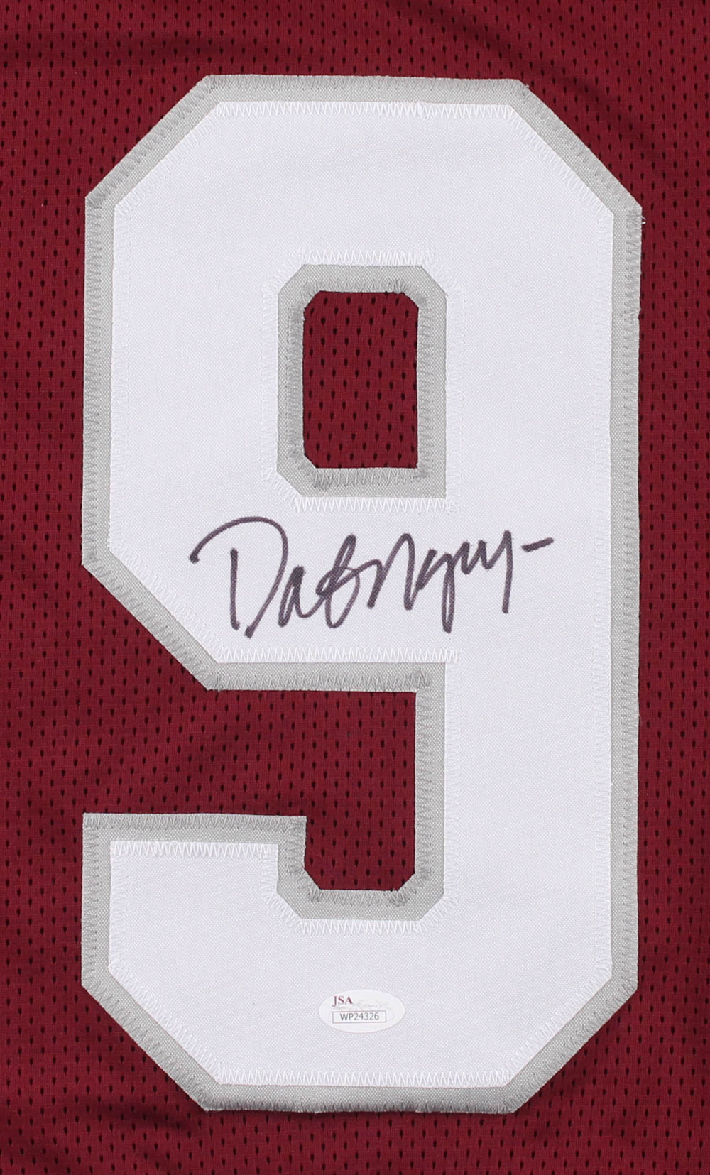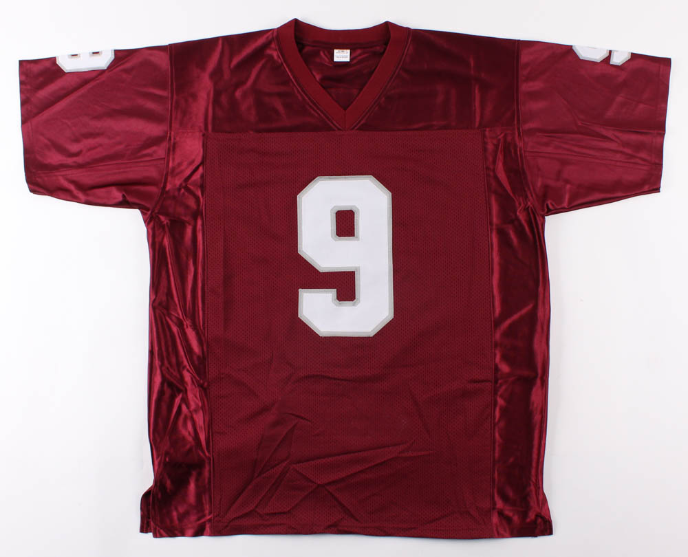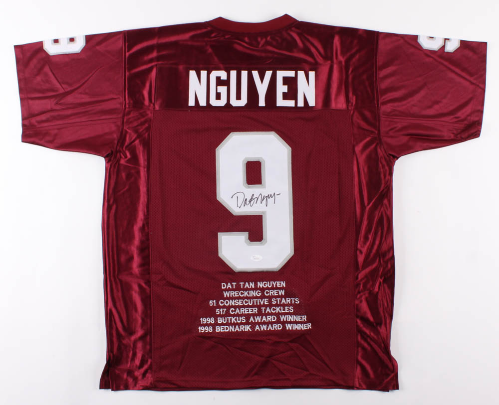 Custom on-field style jersey. Everything sewn on, size XL. Hand-signed in black felt-tip pen by Dat Nguyen. Nguyen's college career highlights have been custom stitched onto the back of the jersey below the reverse numbers.