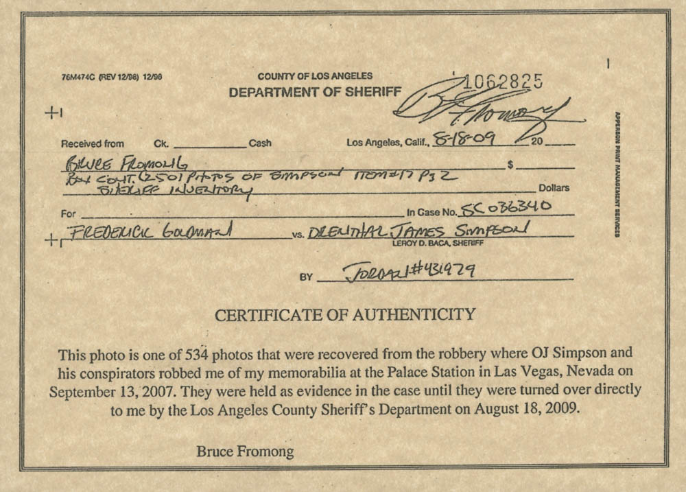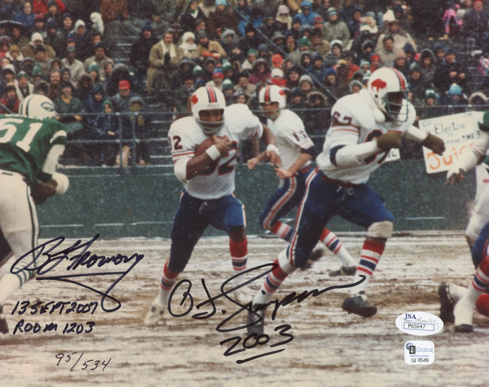 Photo measures 8" x 10" in size and has been hand-signed and inscribed in black felt-tip pen by O. J. Simpson (Buffalo Bills, HOF) and Bruce Fromong. The photo is limited edition out of 534. It comes with a JSA COA and a COA from Bruce Fromong, the dealer that was robbed!