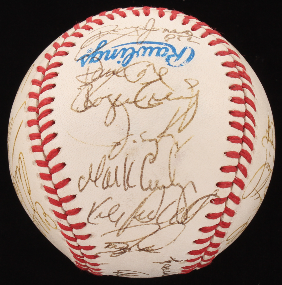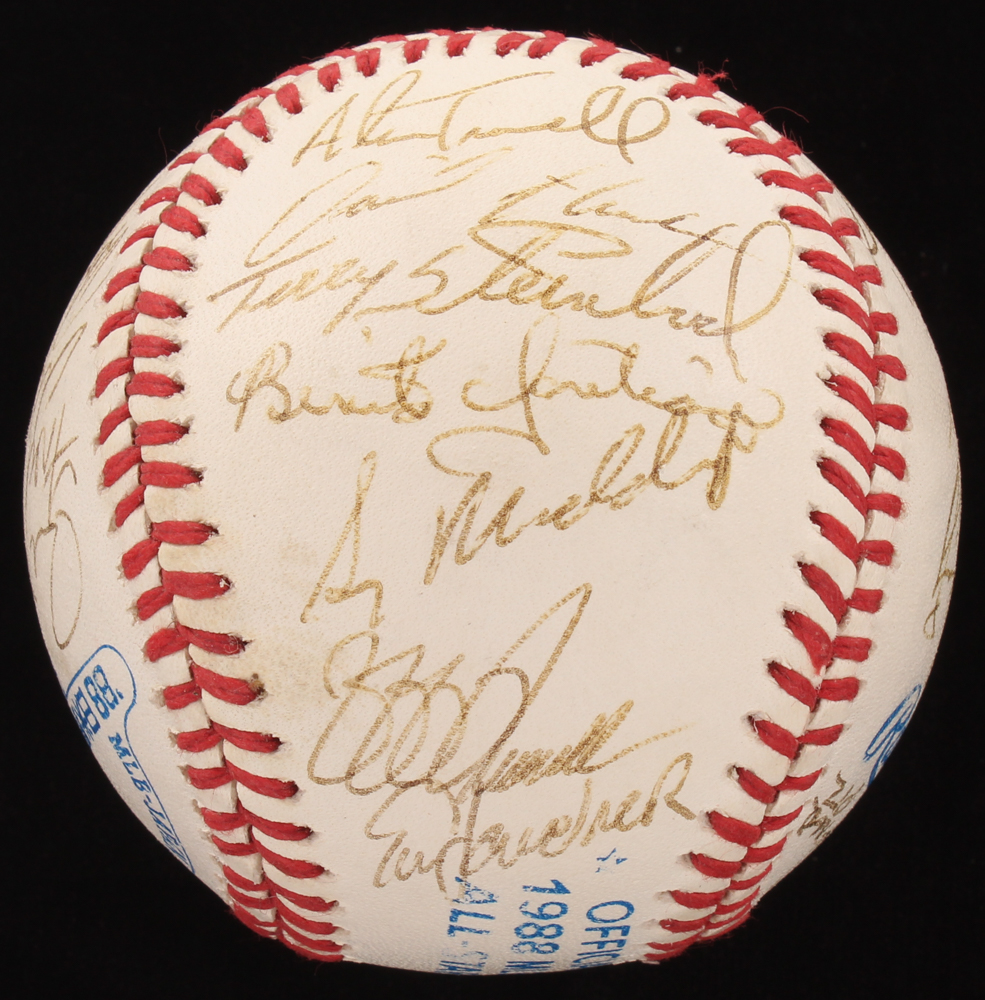 Rawlings Official 1988 MLB-Japan All Star Games Logo baseball has been hand-signed in black ink pen by (26) including Sparkey Anderson, Vance Law, Kirby Puckett, Ellis Burks, Orel Hershiser, Alan Trammell, Terry Steinbach, Fred McGriff, Alex Grammas, Mark Gubicza, Rafael Palmeiro, Mark Davis, Paul Molitor, and (13) others.