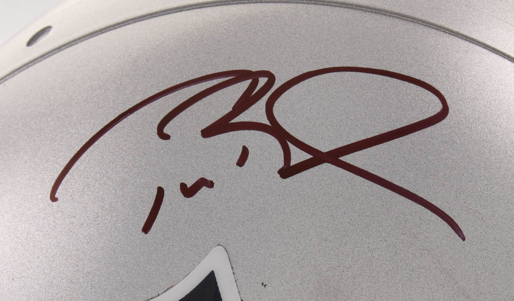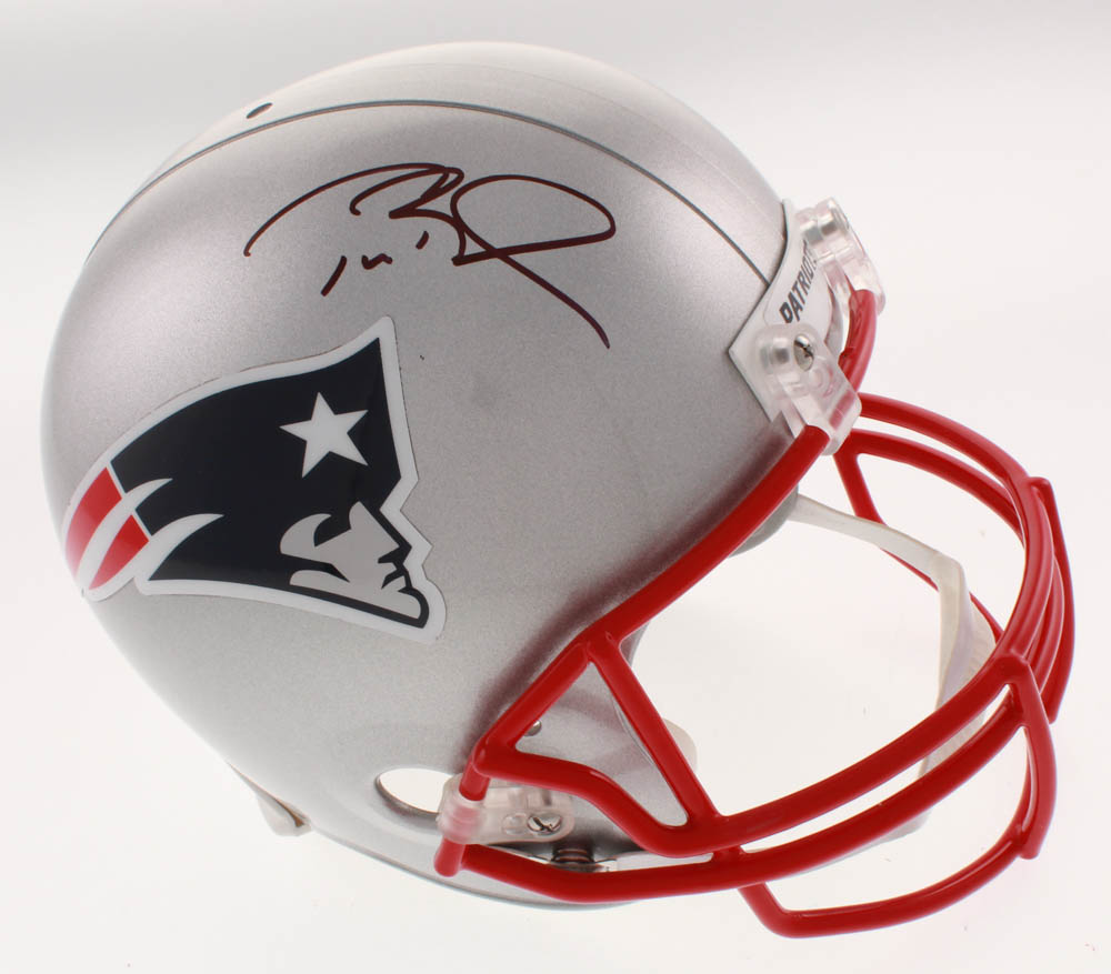 Riddell New England Patriots full-size replica helmet has been hand-signed in black felt-tip pen by Tom Brady.