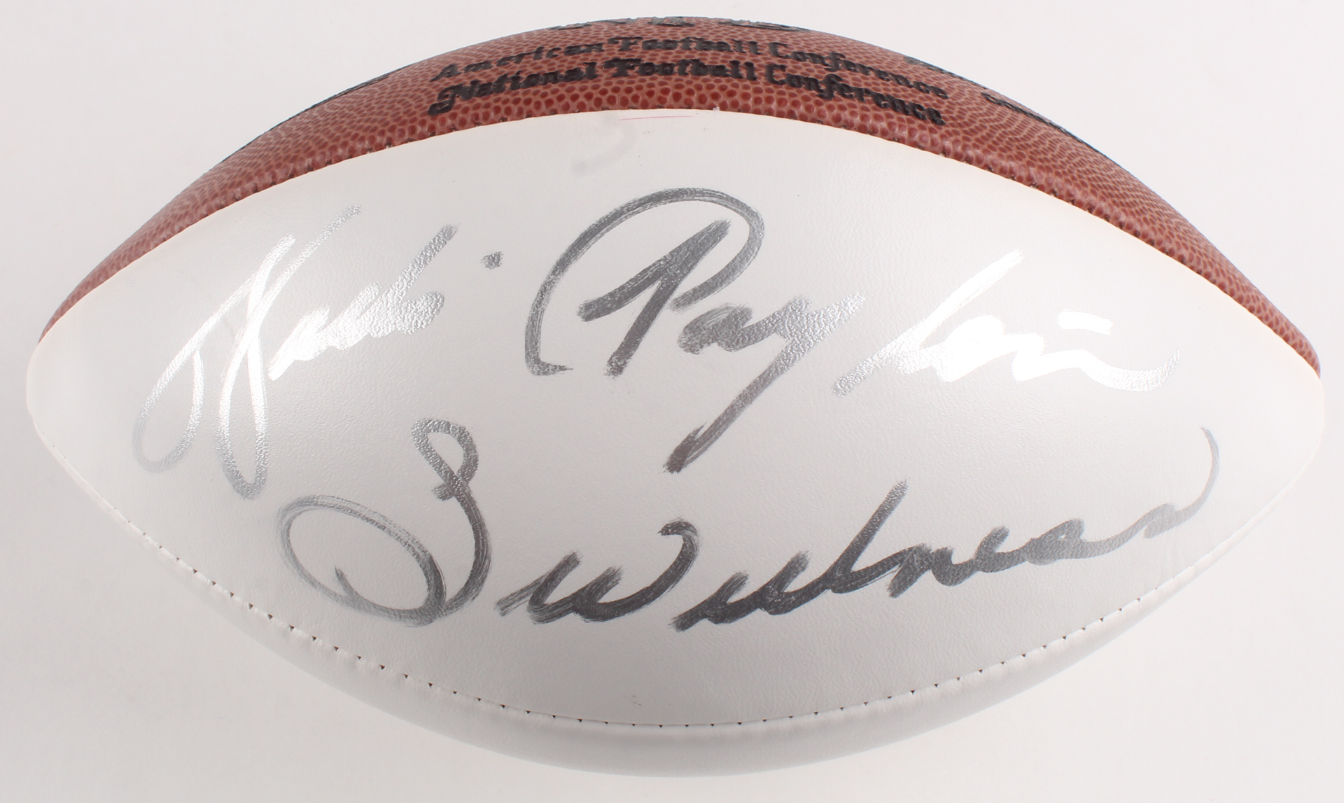 Wilson NFL logo football. Hand-signed in silver paint pen by Walter Payton (D. 1999, Chicago Bears, HOF).