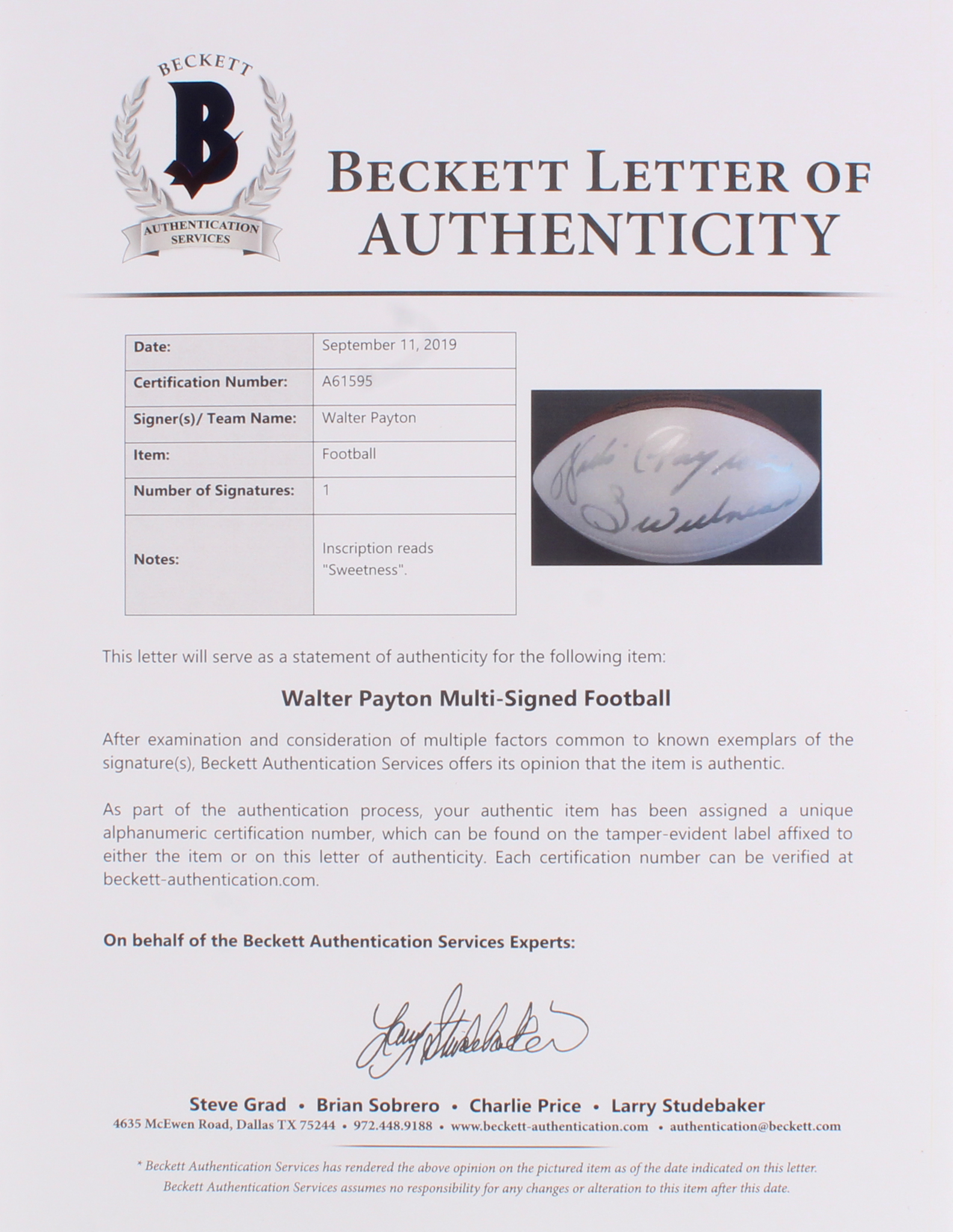 Walter Payton Signed NFL Football Inscribed "Sweetness" (Beckett LOA)
