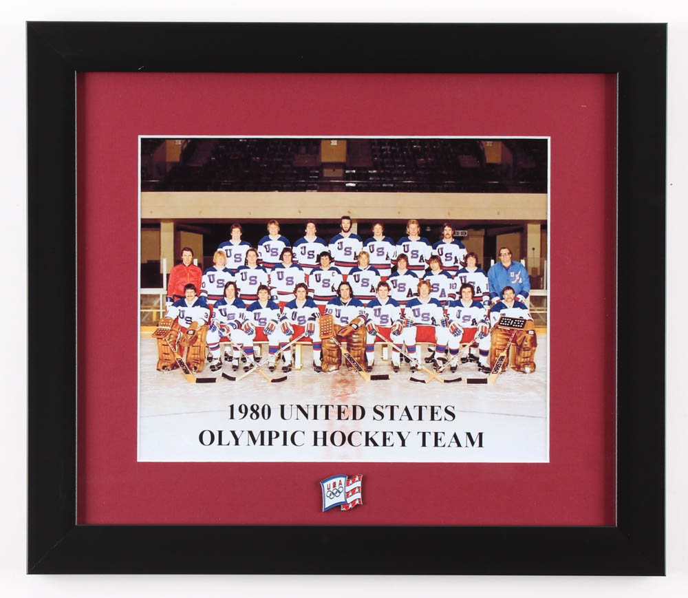 Custom frame measures 13" x 15" in size and features a photo of the USA hockey team during the 1980 Winter Olympics in Lake Placid. Display also includes a vintage Olympic pin.