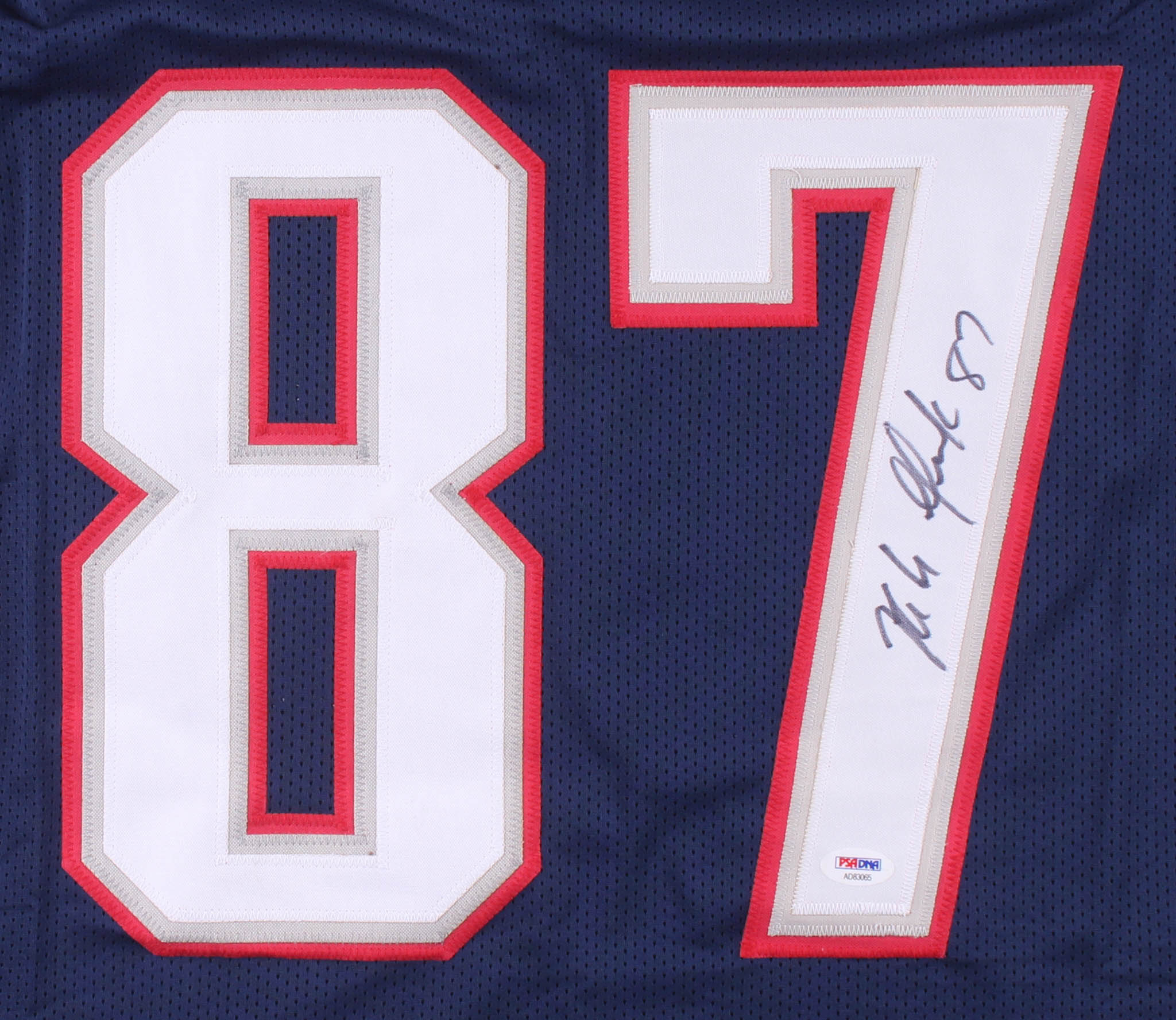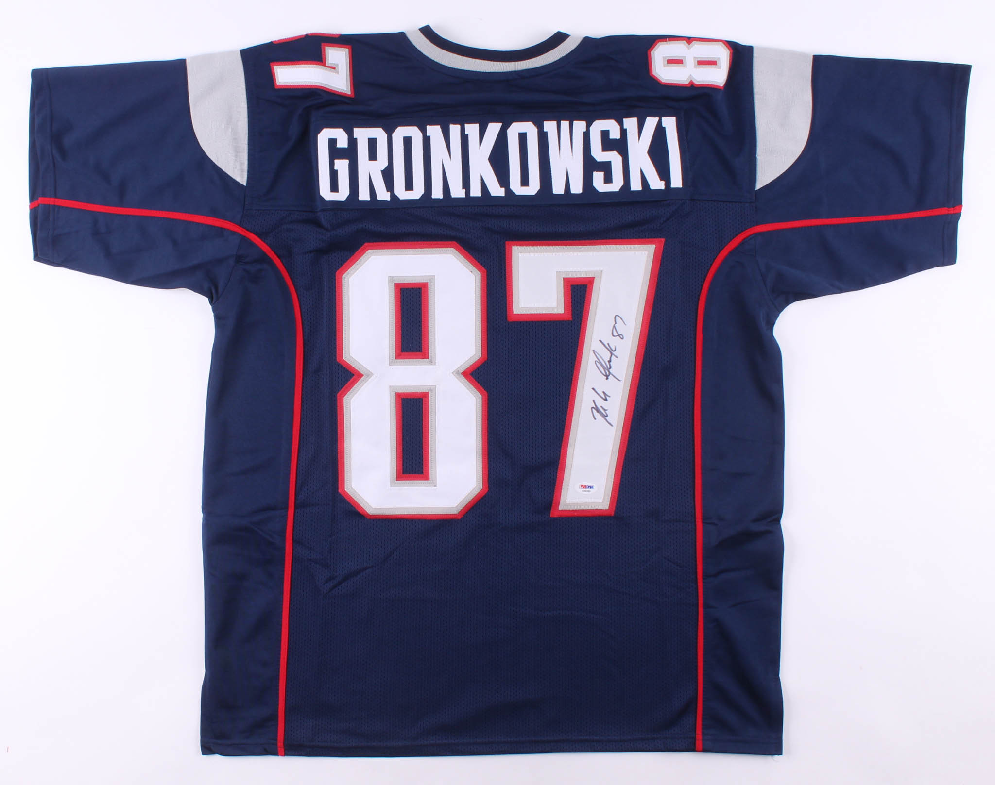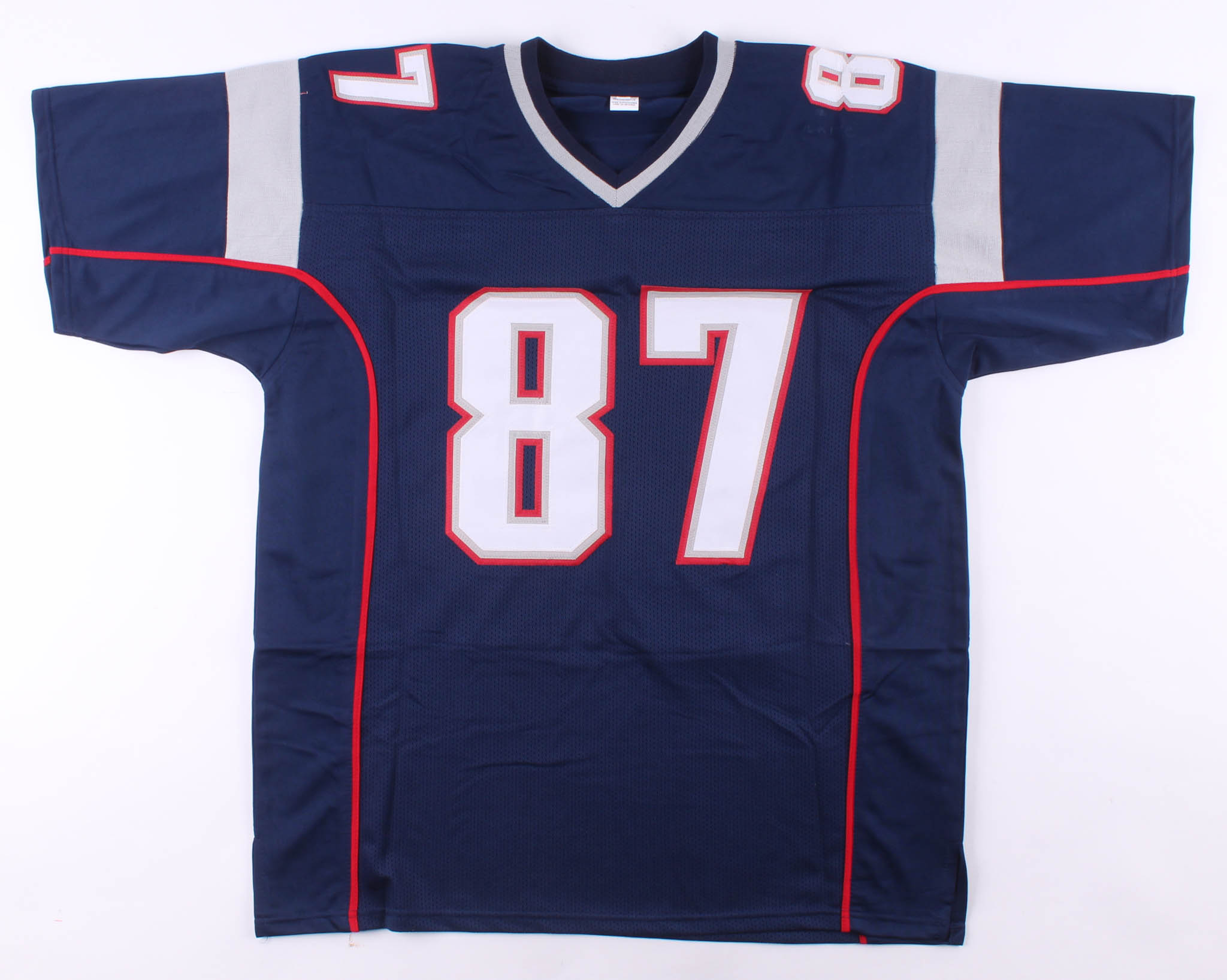 Custom on-field style jersey. Everything is sewn on, size XL. Hand-signed in black felt-tip pen by Rob Gronkowski.