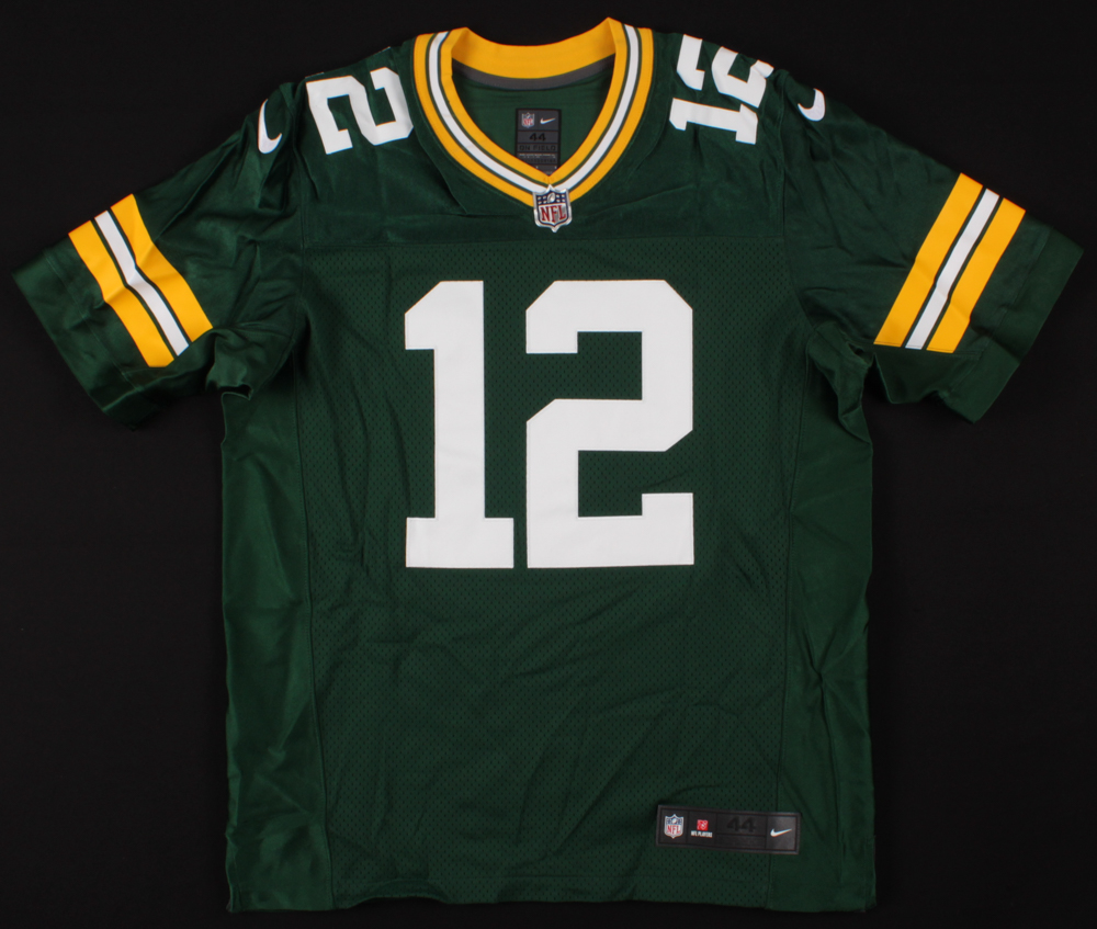Nike on-field style jersey. Everything sewn on, size 44. Hand-signed in black felt-tip pen by Aaron Rodgers.